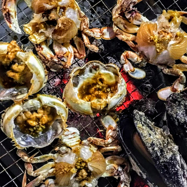 이제 반대쪽 딱지를 해치울 차례. 노란 내장이 붙은 딱지는 숯불에 올릴 때 고추냉이를 약간 섞은 초간장을 더해준다. 열을 받으면 보글보글 끓어오르는데, 이때 불 위에서 꺼내 밥을 올려 슬슬 비벼 먹는다. 쌉싸래한 내장의 맛과 고추냉이 간장과 뒤섞인 바다의 짭짤한 맛이 먹을수록 입맛을 돋운다.