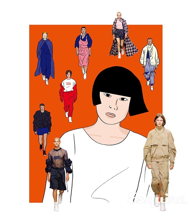펑첸왕은 갓 데뷔한 젊은 디자이너에게서 기대할 수 있는 키워드를 적극적으로 활용한다. 스포티즘, 로고, 오버사이즈, 스트리트웨어 같은 것. 재미있는 건, 그럼에도 불구하고 예측하지 못한 결과를 만들어내는 것이다. 상하이에서 자라고 런던에서 공부하고 뉴욕에서 컬렉션을 만드는 동안 스며든 이국의 낯선 정서들이 복합적으로 영향을 주었을 터. 그래서 펑첸왕의 컬렉션에는 ‘MADE IN CHINA’ 레터링 티셔츠도 있고, 극단적으로 해체된 셔츠도 있고, 지극히 상업적인 보머 재킷도 있다. 무엇보다 인상적인 건 파격적인 실루엣. 테크니컬한 소재로 마음껏 부풀리거나 제멋대로 늘어뜨린 옷을 보면 대륙적 해방감이 든다. 그 와중에 주름 장식으로 분명하게 중심을 잡는 건 여성 디자이너라서 가능한 섬세한 시선.