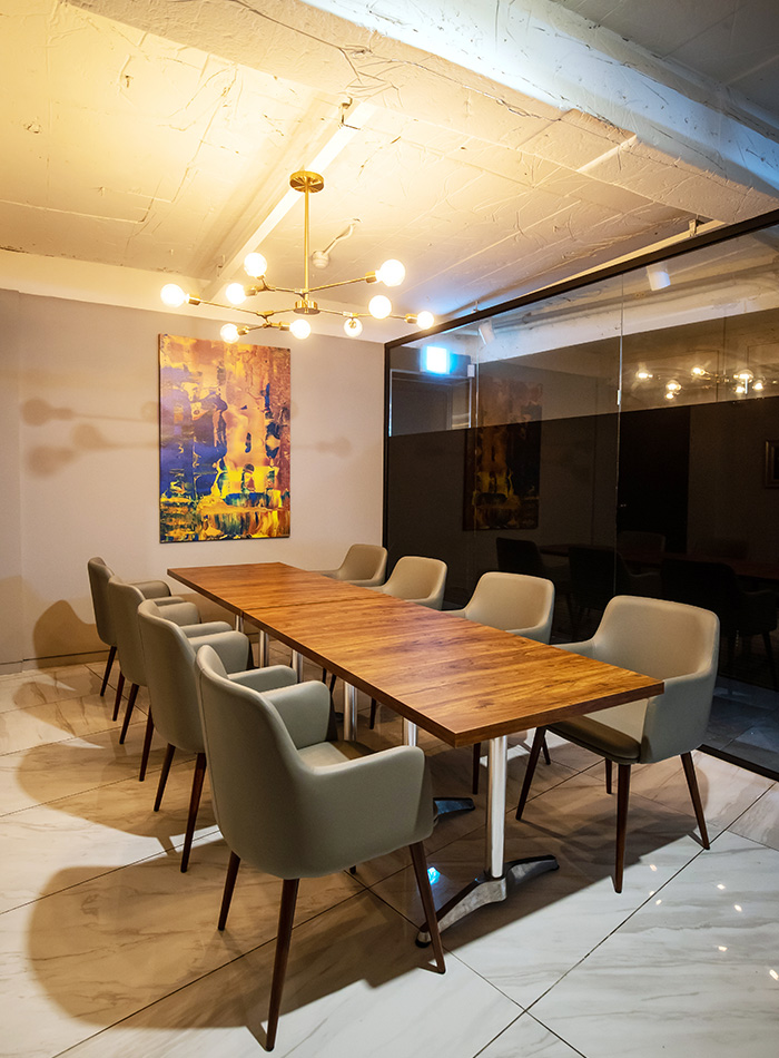 ‘더훈’은 경사진 지형 2층에 위치한 식당이다 보니 입구에 접근하려면 계단을 지나야 한다. 길 위에서 볼 땐 레스토랑이 지하에 있는 느낌인 반면, 길 아래에서 올려다볼 땐 2층에 있는 것이 확연히 느껴진다. 레스토랑에 들어가면 이 비밀스러운 공간의 진가는 더욱 발휘된다. 입구를 중심으로 좌측은 부스형 테이블이라 일부러 일어서서 보지않는 한 잘 보이지 않는다. 우측은 아예 아크릴 벽으로 경계를 나눈 분리형 공간이고 식당 깊숙이 들어가면 한 가족이 다 함께 식사 가능한 비밀스러운 공간이 따로 있다. ‘더훈’에서 식사를 할 때만큼은 다른 사람들의 눈치를 볼 이유가 없다.