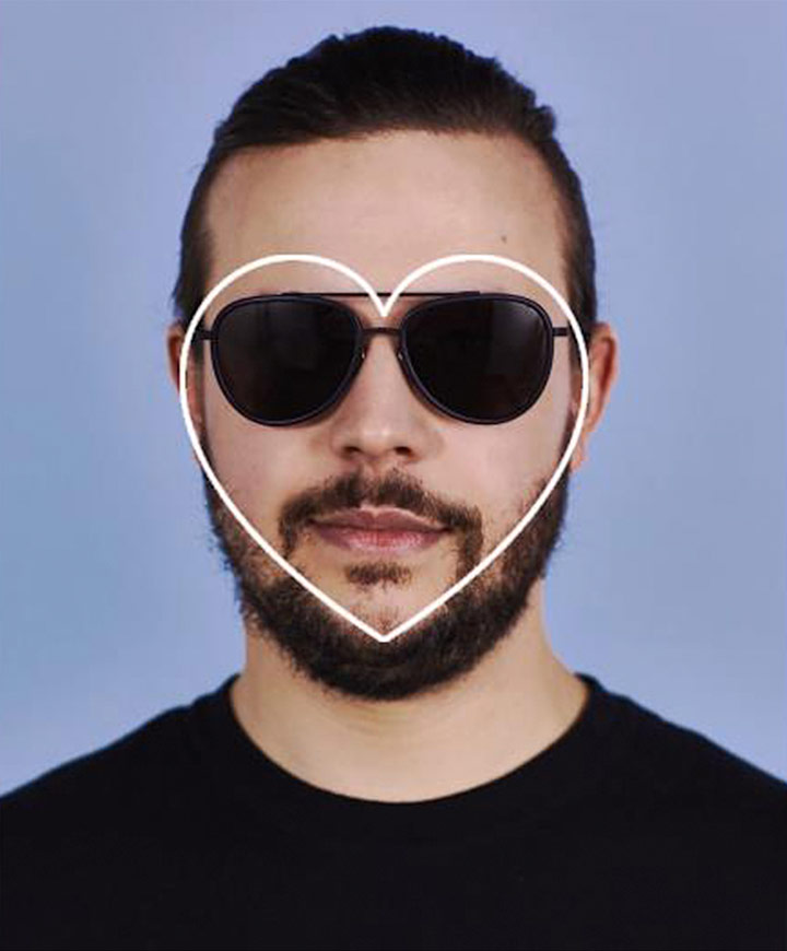 이 얼굴형에는 너무 넓거나 무거운 느낌의 선글라스는 잘 어울리지 않는다. 그렇다고 걱정하지는 말 것: 비밀 병기가 하나 있다. 클래식한 형태의 눈물방울 모양의 에비에이터 선글라스는 대부분의 사람들에게 어울리지만, 아래쪽 얼굴에 좀 더 무게감을 실어주기 때문에 하트 얼굴형을 가진 사람에게는 특히나 더 안성맞춤이다. 빈티지한 느낌을 주고 싶다면 광택이 있는 프레임에 미러 렌즈를 선택하거나, 좀 더 튀지 않는 스타일을 원한다면 매트한 프레임에 비슷한 컬러 렌즈의 제품을 선택하도록 하라.