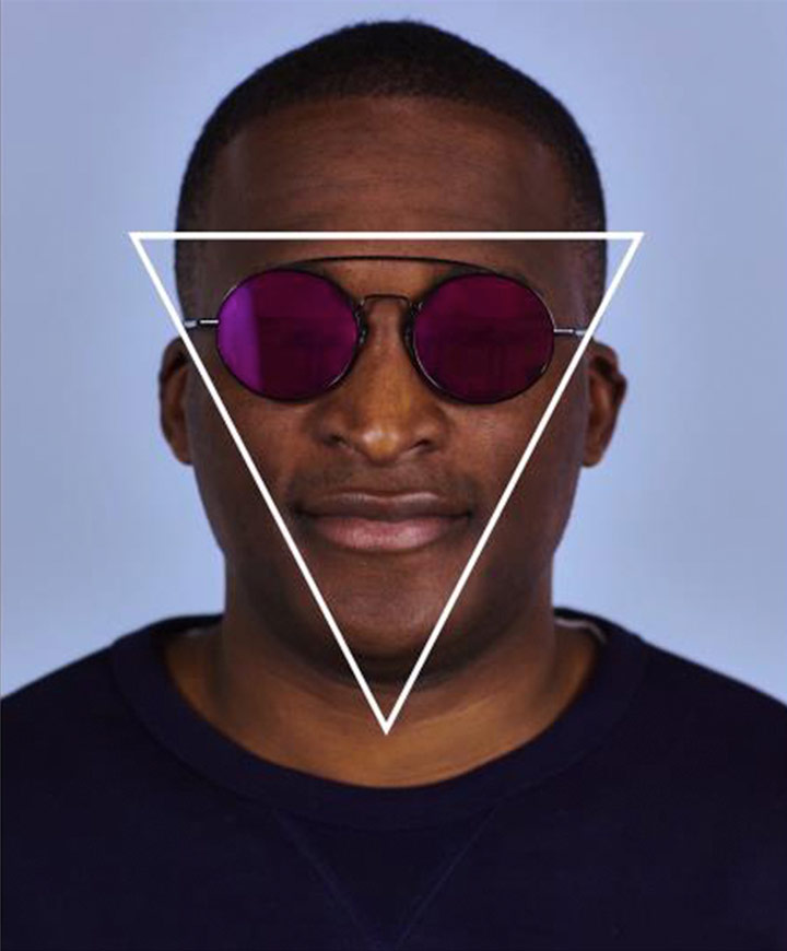 둥근 렌즈의 선글라스는 보다 직선 형태인 당신의 얼굴선을 더 부드럽게 만들어줄 수 있다. 하지만 선글라스의 윗면이 너무 무거운 제품은 선택하지 않는 편이 낫다. 예를 들어, 눈썹 선이 아세테이트(고급 플라스틱 재질) 소재로 된 레이밴 클럽마스터와는 넓은 이마를 더 강조하는 역효과를 낳을 수 있다. 여기에서 보여지는 와이어 프레임의 더블 브릿지형 선글라스라면? 역삼각 얼굴형에 잘 어울릴 테니 선택해보도록 하라. 좀더 클래식한 느낌의 선글라스를 원한다면 거북이 등 프레임에 키홀 형태의 브릿지가 있는 제품을 선택해 빈티지한 멋을 추구해도 좋다.