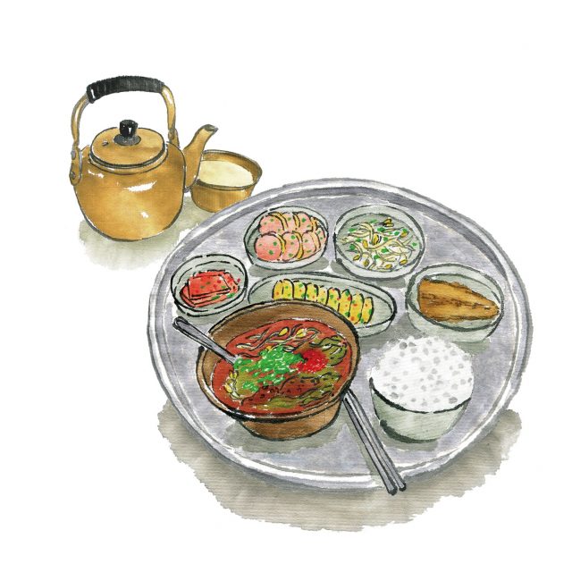그렇다면 도대체 백반이란 뭔가. 하얀 밥이란 뜻인가. 누구는 반찬이 많은(百) 밥이라고 하는데 그것도 꽤 설득력이 있다. 전라도 쪽의 밥상을 한번 보라. 반찬을 놓을 자리가 모자라 겹쳐 쌓기의 신공이 흔하지 않은가. 어쨌든 백반은 쌀밥과 몇 가지 반찬과 국으로 구성된 전형적인 우리네 집 음식이며, 그것이 가정식이라는 이미지를 입고 시중의 밥집에서 흔하게 파는 음식이 되었다. 이건 남북이 따로 없어서 옥류관이나 북한의 여러 식당에서도 밥상이라는 이름으로 팔리고 있다. 순댓국이 들어가면 순댓국 밥상, 된장찌개가 올라가면 된장찌개 밥상. 백반 문화는 유구하여 우리 민족 음식의 살아 있는 화석이라고 해도 과언이 아니다. 밥과 반찬, 국으로 이루어진 이 기본적인 상은 스테이크와 빵과 커리와 파스타와 베트남 국수가 실제 우리가 즐겨 먹는 음식이라고 하더라도 여전히 한식의 표준적인 이미지를 구성하고 있다. 나 같은 올드한 세대는 백반으로 말미암아 살아왔으며, 앞으로 백반을 먹으며 죽을 것이다. 내가 먹어치운 백반은 집에서 먹은 진짜 가정식을 포함하여 계산하면 하루 세 끼 × 365일 × 53년
