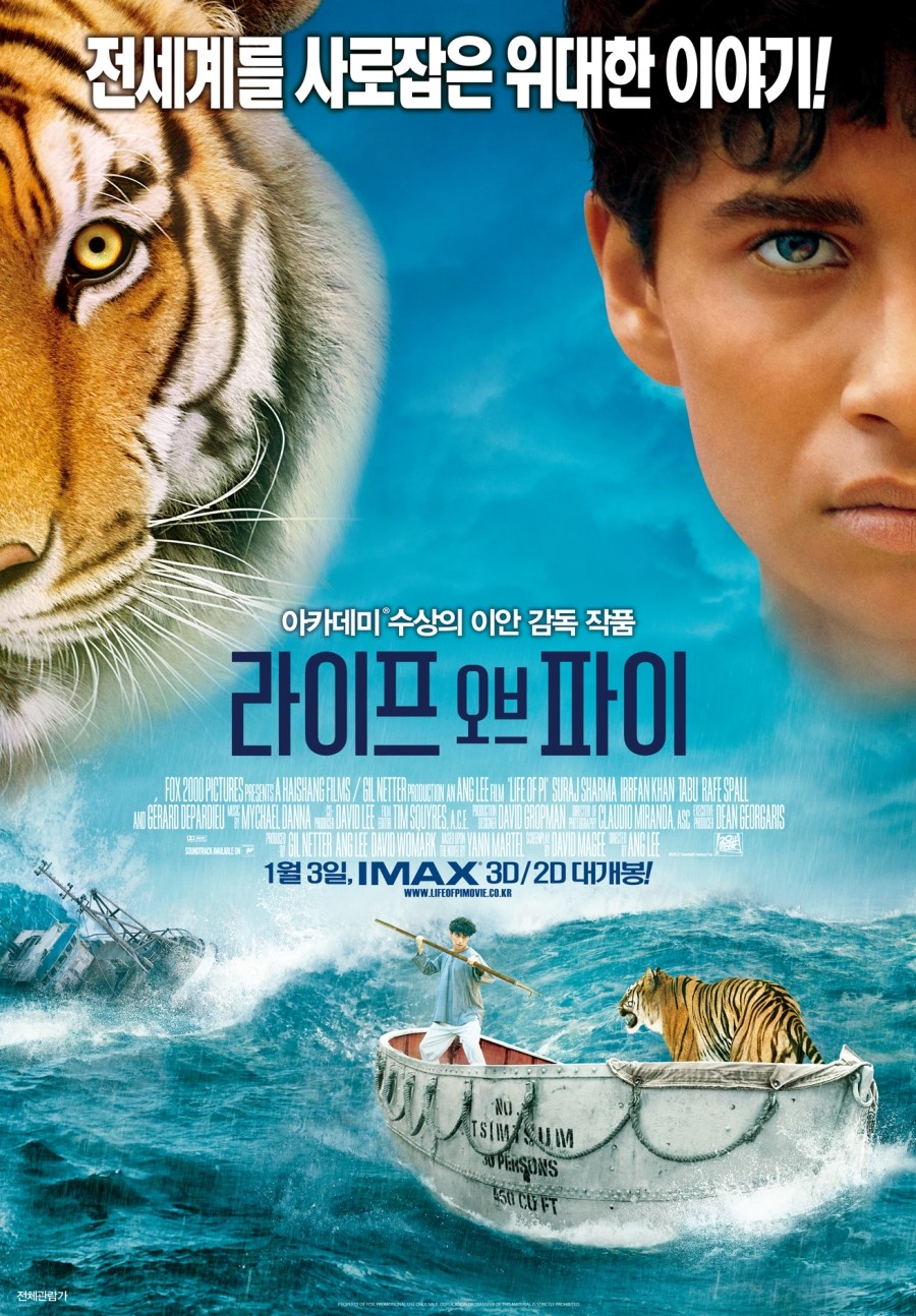 세계적 스테디셀러 얀 마텔의 <파이 이야기>를 원작으로 만든 영화로 국내에서 지난 2013년 개봉했다. 태평양 한가운데서 살아남은 소년과 호랑이가 겪은, 믿기 어려운 227일일간의 모험을 그린 이야기. 조난된 배 위에서 주인공 '파이'는 호랑이 '리처드 파커'를 살리기 위해 사냥을 하고, 끝까지 돌보는면서 고난을 극복하고, 삶의 의미를 발견하며 살아남는다.