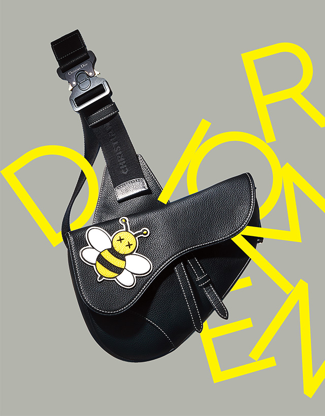 카우스가 재해석한 꿀벌 캐릭터와 매튜 윌리엄스의 버클이 더해진 초현대적 새들백. 가격 미정 디올 맨.