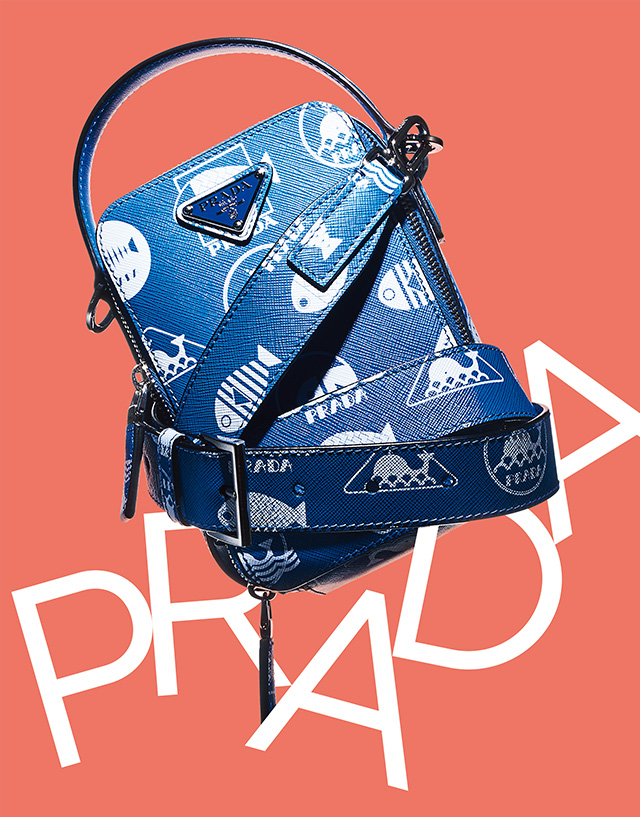 청명한 파란색 사피아노 가죽에 귀여운 고래 일러스트를 그려 넣었다. 벽돌 모양의 미니 숄더백. 가격 미정 프라다.