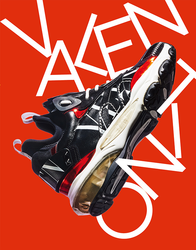 패브릭과 가죽, 네오프렌을 구조적으로 조합한 바운스 로우톱 스니커즈. 소재와 색, 프린트의 흥미로운 충돌. 133만원 발렌티노 가라바니.