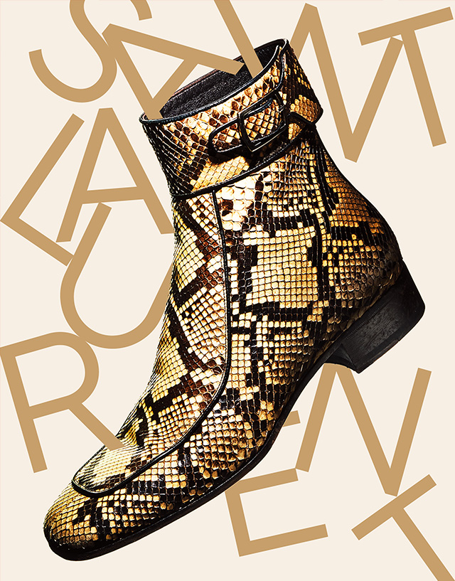 사각 형태의 앞코와 두툼한 버클 장식이 특징인 마일스 부츠. 뱀피 가죽으로 호화롭게 만들었다. 가격 미정 생 로랑 by 안토니 바카렐로.