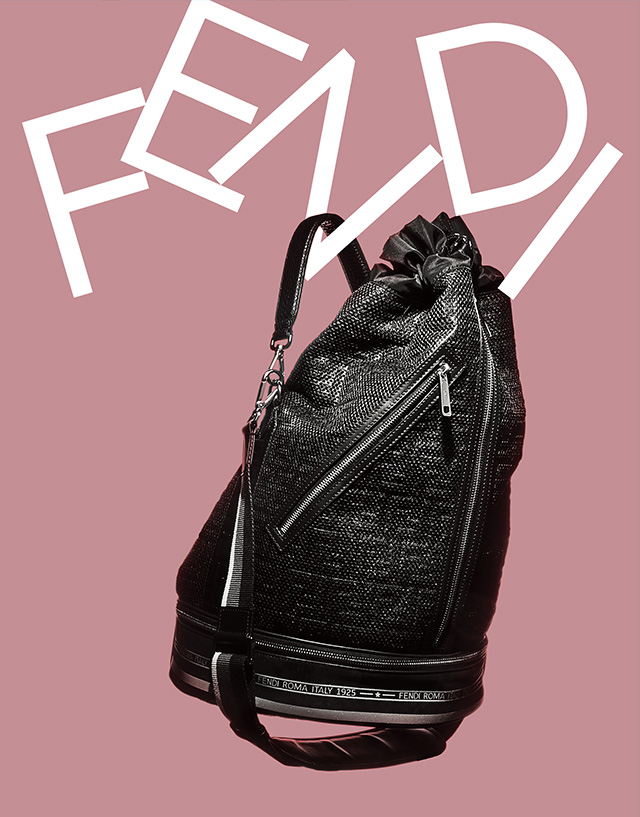 펜디의 남성용 몽트레저 백. 로고를 반복적으로 넣은 자카르 소재 버킷백에 두 개의 핸들을 달았다. 299만원 펜디.