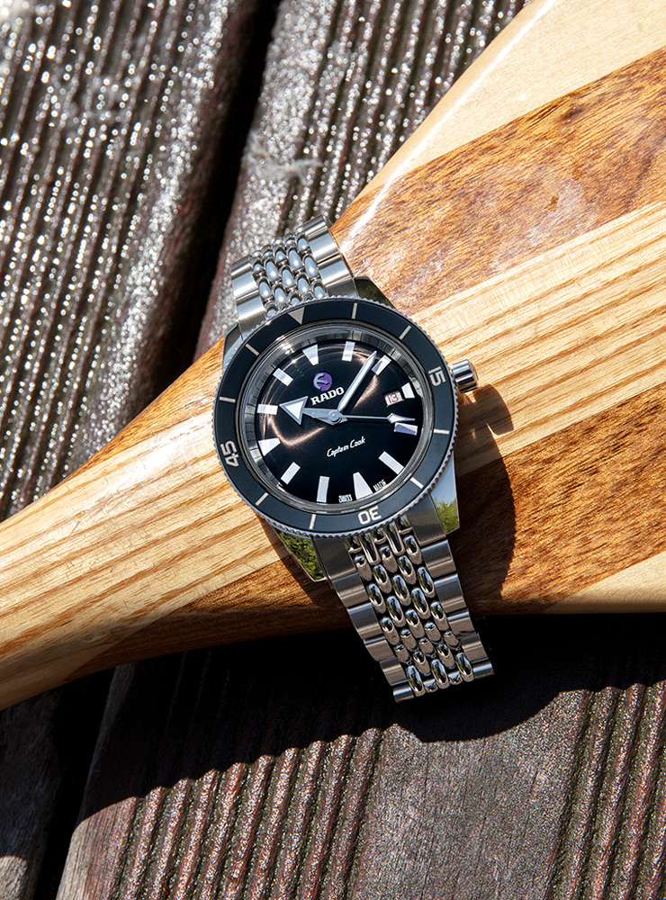 스위스 렝나우에서 처음으로 빛을 본지 57년도 더 지난 지금 다시 돌아온 라도 캡틴 쿡은 역사적 아카이브를 단순히 재현하는데 그치지 않고 현대적으로 재해석했다. ‘소재의 선구자’답게 최신 소재를 적용한 것은 물론이다. 라도 캡틴 쿡 컬렉션은 라도의 역사적인 다이버 워치 모델을 복각한 헤리티지 시계로 주목할 만하다. 이제 전통에 얽매이지 말고 시대를 이끈 개척 정신을 일깨우자. 규칙보다는 도전을 중시하고 익숙함보다는 새로운 도전과 탐험의 세계로 이끌 아이코닉한 타임피스의 화살과 검 모양 핸즈는 여전하다. 트렌드를 반영해 케이스 크기를 좀 더 현대적인 비율의 42mm 사이즈로 조정한 것도 새롭다.