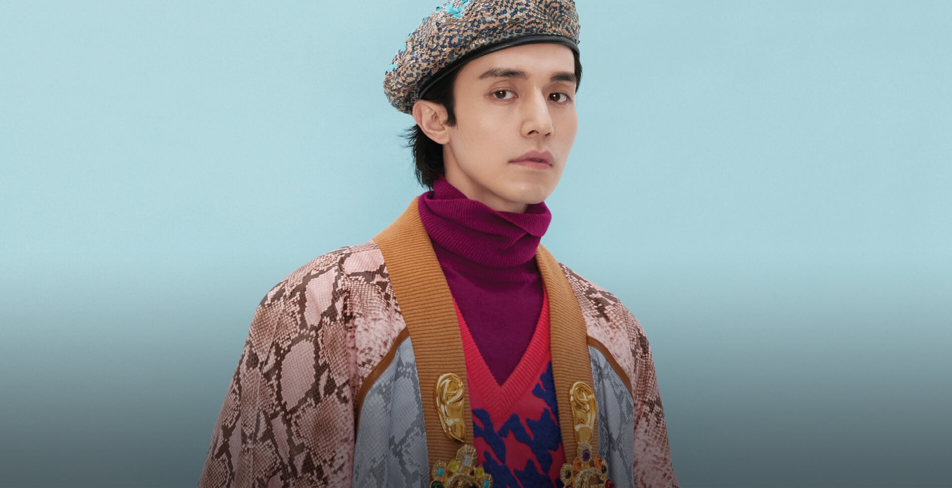 니트 디테일의 멀티컬러 파이톤 소재 보머 재킷, 브이넥 울 스웨터, 캐시미어 터틀넥 니트, 웹과 파이핑 디테일의 스트레치 저지 팬츠, GG 모티프의 시퀸 베레모, 귀 모티프 브로치, GG 로고 메탈 브로치 모두 구찌.