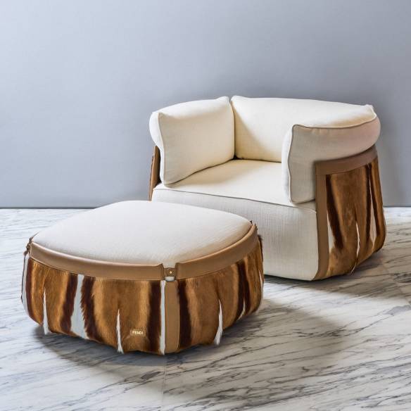 1인용 소파, 로즈우드 테이블, 테이블 위의 크리스털 오브제 모두 펜디까사.