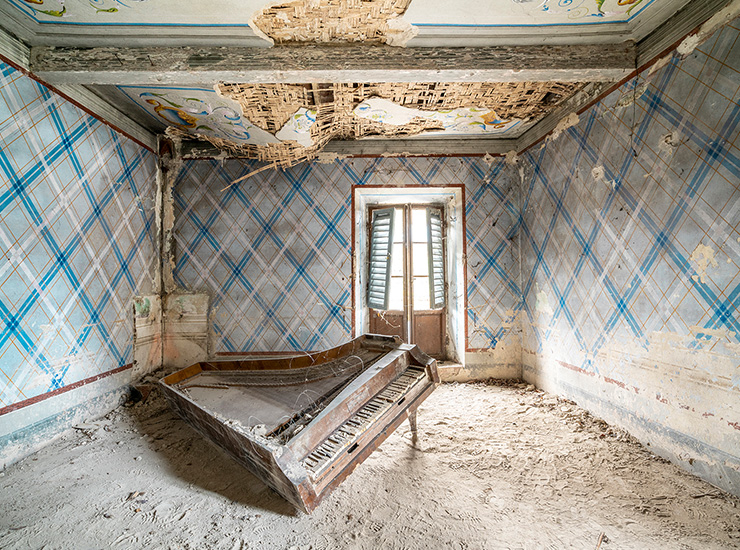 <Requiem pour Pianos>는 실상 사진가의 개인사에 연원한 프로젝트다. 로메인 티에리는 5살 때부터 피아노를 치기 시작해 15년 동안 음악학교를 다닌 아마추어 피아니스트이며, 그의 어머니는 문화유산 촬영을 전문으로 하는 사진가였다. 그는 10여 년 전 피아노에서 사진으로 진로를 바꿨고 마침 프랑스의 고건물을 촬영하던 어머니의 프로젝트에 동행하기로 했다. 그리고 그 행로에서 또 다른 운명을 맞닥뜨린다. 2014년 프랑스 남서부의 한 버려진 성을 찾았다가 내부에 방치된 피아노를 발견한 것이다. “그 순간 제 예술 세계가 바뀌리란 걸 직감했어요. 사진과 피아노의 교차로에 놓이게 되리란 걸요. 마음속에 두 갈래의 열정을 갖고 있던 제게는 그 풍경이 ‘예술의 정점’이었으니까요.” 그가 피아노를 찾는 주된 방식은 구글어스, 혹은 옛 사진을 살피거나 지구 곳곳의 팬들이 보내주는 정보를 검토하는 것이다. 하지만 여전히 의도치 않게 버려진 피아노를 마주칠 때도 있다고 했다. 그 감흥에 대해서는 “말로 표현하기 어려운 특별한 경험”이라는 짧은 문구로만 표현했다.