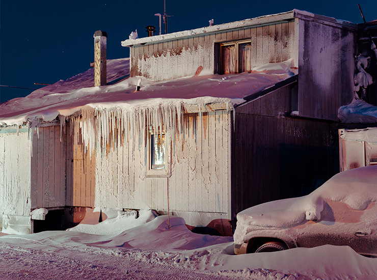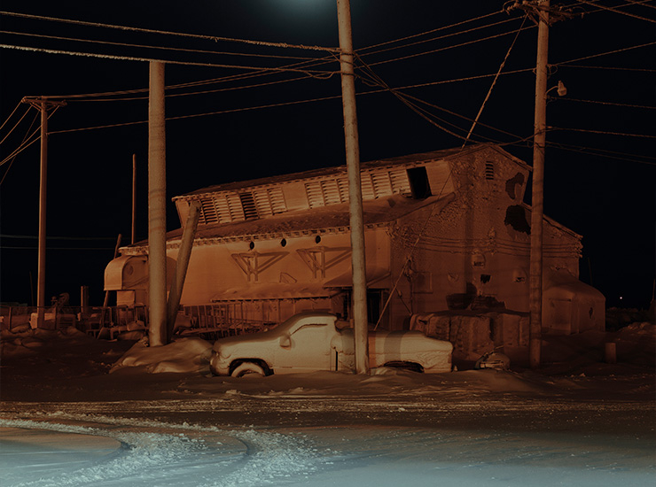 단, 마크 머헤이니가 ‘어둠’이라고 말할 때는 그 맥락에 주의를 기울일 필요가 있다. 대체로 사진가의 언어, 즉 조도에 관한 표현이지만 때때로 심상에 관한 표현이기도 하니까. 이를테면 “어둠은 어둠을 불러왔습니다”라는 문장으로 시작한 이 인터뷰의 답변처럼 말이다. “우트키오야비크는 제가 가본 그 어떤 곳과도 달랐습니다. 햇볕도, 마을과 외부를 잇는 도로도, 나무도, 신선한 음식도 없었죠. 그리고 극야 기간 동안 우울증, 범죄, 약물 남용과 자살이 급증합니다. 거리 곳곳에서 특유의 ‘에너제틱한 무거움’을 느낄 수 있죠.” 어둠을 주제로 한 프로젝트가 이토록 다채로운 컬러 팔레트를 갖게 된 것도 그런 이유다. 모든 것을 뒤덮은 새하얀 눈과 완벽한 어둠 속에서는 가로등, 옥외 조명, 자동차 라이트 같은 인공조명이 각각의 색온도를 선명하게 드러낸다. 그리고 마크 머헤이니의 눈에는 이 솜사탕 같은 색상들의 레이어가 마을에 감도는 기괴함이 표면화한 순간처럼 보였다고 한다.