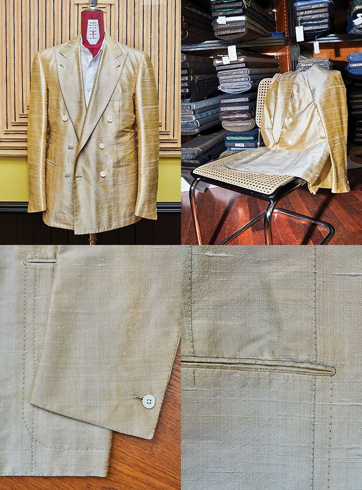 발색이 좋은 산둥 실크 리넨 재킷. 리넨 소재에 중국 산둥 지방에서 만든 실크를 섞어 부드럽고 구김이 적다. 특유의 찢김이 있는 듯한 텍스처가 특징. 더블브레스트 형태로 만들어 더욱 과감하고. 한껏 올라간 피크트 라펠, 양쪽 라펠이 모두 뚫린 부토니에, 한 개만 달린 소매 단추 등의 디테일이 돋보인다. 많은 디테일이 들어간 재킷은 자칫 산만해 보일 수 있는데 전병하 테일러의 감각으로 적절한 균형을 맞췄다. 여름엔 조금 더 과감하게.