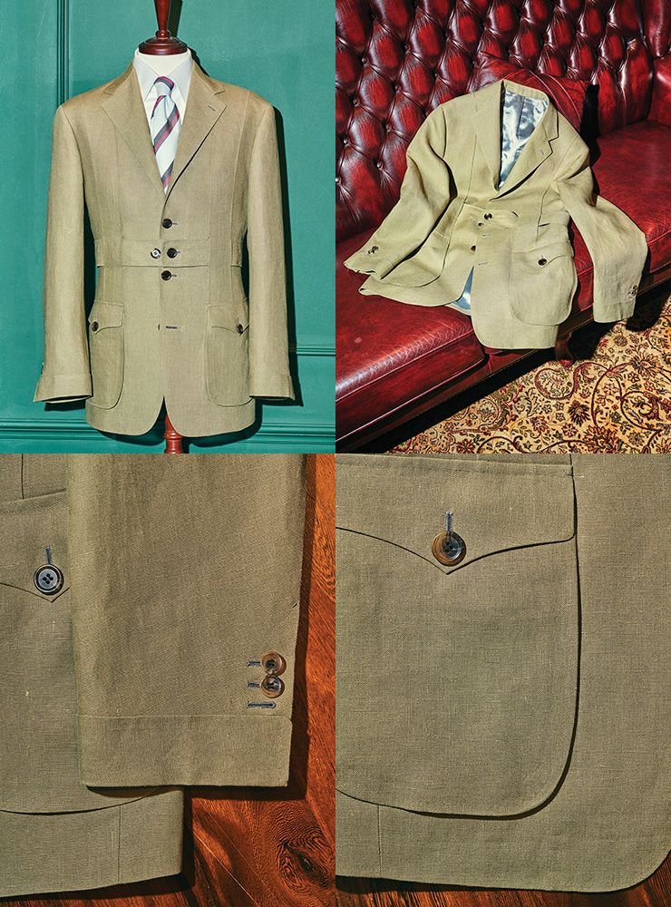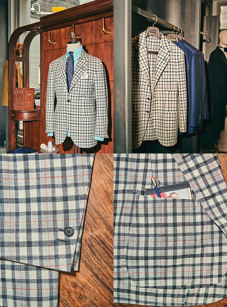 1940~1950년대 영국에서 레저용으로 입던 노퍽재킷 형태를 현대적으로 재해석한 재킷. 리넨으로 만들어 가볍고 시원하다. 노퍽재킷은 미적으로도 훌륭하지만 레저라는 본래의 목적을 잊지 않고 기능에도 충실했다. 높은 고지부터 달아놓은 단추는 활동성을 높이고, 허리춤에 더한 끈과 단추는 라펠이 벌어지는 것을 최소화한다. 앞쪽 포켓에 달린 단추는 활동 시 소지품 분실을 줄이고. 사냥할 때를 위해 자연색을 주로 사용했는데, 이를 고증해 베이지 계열 원단을 선택했다. 국내에서 맞출 수 있는 유일한 노퍽재킷.