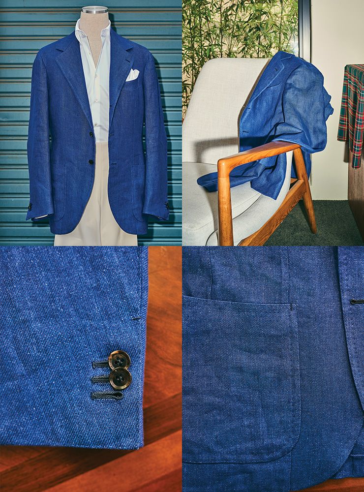 블루 컬러 스포츠 재킷. 리넨 소재를 사용해 가벼우며 클래식한 블루 컬러는 청량한 느낌을 준다. 이탈리아 밀라노의 재킷 만드는 방식을 따른다. 어깨는 볼륨 있게, 허리는 잘록하게. 가슴 부분부터 재킷 아래까지 이어지는 다트 또한 밀라노의 방식. 자연스럽게 구겨진 포켓스퀘어를 꽂고, 화이트 컬러 셔츠와 베이지 톤 팬츠를 함께 입는다.