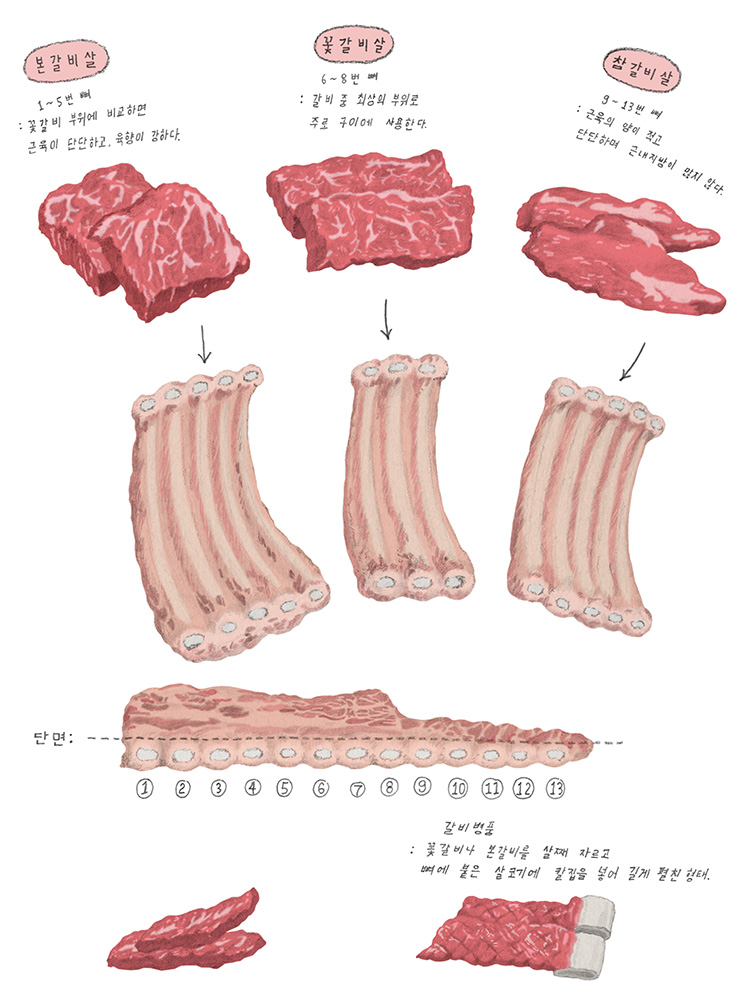 구웠을 때 ‘입에서 녹는’ 근육은 게으른 근육이다. 부들부들 녹는 맛있는 살은 갈비뼈 바깥쪽을 덮고 있는 살 가운데에 있다. 갈비뼈에 번호를 붙일 땐 머리 쪽을 1번으로 한다. 1번부터 5번은 본갈비뼈, 6번부터 8번은 꽃갈비뼈, 9번부터 13번은 참갈비뼈라 부르고, 이 갈비뼈 위를 덮고 있는 살을 각각 본갈비살, 꽃갈비살, 참갈비살이라 부른다. 이 중 본갈비살의 근육은 숨을 쉴 때와 소의 앞다리가 움직일 때 긴장과 이완을 반복해 단단하다. 배 쪽에 있는 참갈비살 역시 근육의 양은 적지만 호흡할 때 횡격막의 움직임에 따라 긴장과 이완을 반복해 근조직이 단단하다.