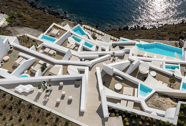 이토록 기하학적인 건축물이 어째 낯설지만은 않다면, 그건 당신의 잠재의식에 특정 이온 음료 CF의 잔상이 남아 있어서일 확률이 높다. 배우 손예진이 골목을 내달리거나 자전거를 탔던 곳이 바로 이곳, 그리스 산토리니의 이아마을이니까. 물론 이제 막 오픈한 세인트 호텔 산토리니가 2000년대 초반의 CF에 등장했을 리 만무하다. 다만 이 호텔이 마을의 낡은 주택들을 매입해 그 유산을 최대한 살리고자 했다는 점, 마을의 미관에 누가 되지 않는 선에서 모던하게 재단장한 결과라는 점을 참작할 수 있겠다.
