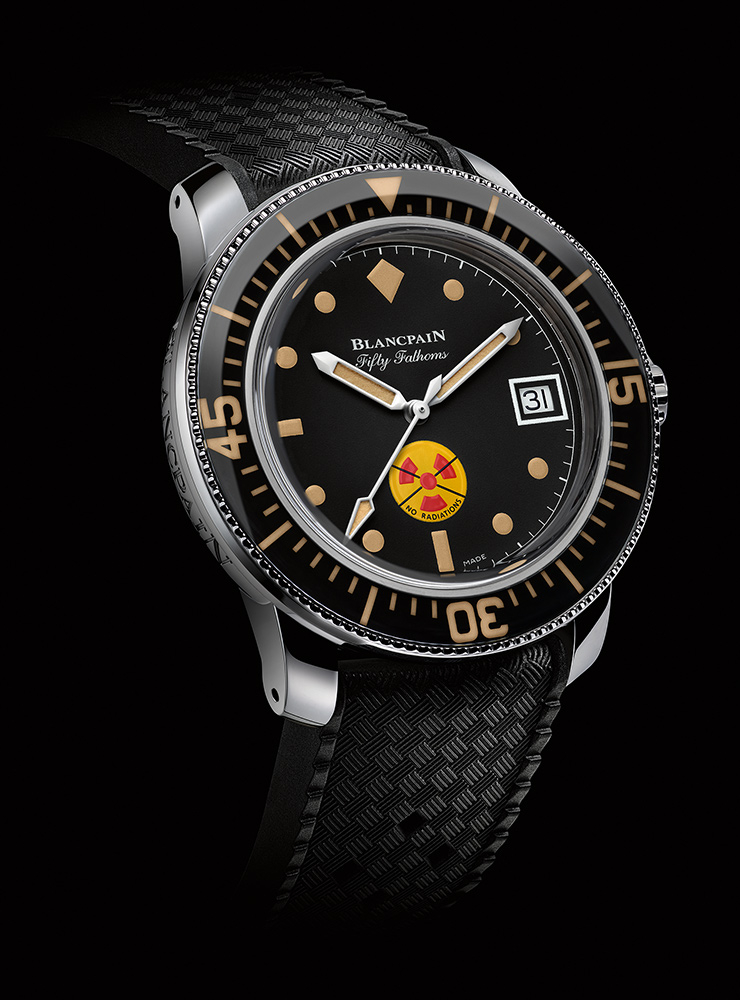 」 트리뷰트 투 피프티 패덤즈 노 래디에이션 야광 도료로 사용되던 라듐이 방사능 물질로 밝혀진 것은 1960년대 초반. 이에 블랑팡은 피프티 패덤즈에 라듐이 쓰이지 않았다는 것을 밝히기 위해 노 래디에이션 마크를 표기했다. 노란 동그라미에 검은색 크로스, 빨간 접근금지 구역이 그려진 이 마크는 매트한 블랙 다이얼 위에서 강렬한 존재감을 드러냈고, 시계 애호가들의 수집욕을 불러일으켰다. 그리고 블랑팡은 올해 트리뷰트 투 피프티 패덤즈 노 래디에이션으로 이 다이얼을 다시 한번 부활시킨다. 케이스 지름은 일반 피프티 패덤즈보다 5mm가량 작은 40.3mm. 리미티드 에디션으로만 선보이는 희소한 사이즈이며, 동일하게 300m 방수를 보장한다. 1960년대 ‘분트 노 래드’ 워치를 재현한 만큼 베이지색 슈퍼 루미노바를 삽입한 챕터링과 핸즈, 화이트 테두리로 강조한 3시 방향의 날짜 창, 필기체로 흘려 쓴 컬렉션명 등 오리지널 디자인에 충실한 세부도 인상적이다.