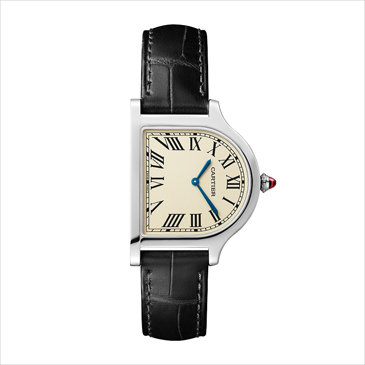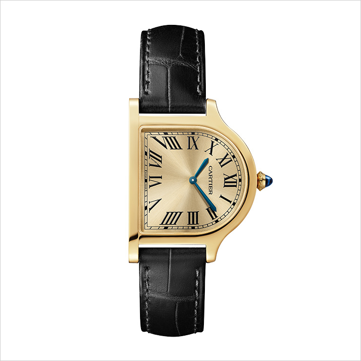 클로쉬 드 까르띠에 까르띠에는 그간 프리베 컬렉션을 통해 메종의 전설적인 모델을 조명해왔다. 올해의 주인공은 1920년 까르띠에 피스로 처음 등장했다가 이후 1922년 제대로 선을 보인 클로쉬 드 까르띠에. 시계를 수평으로 놓았을 때 케이스가 마치 카운터 위의 종을 닮았다고 해서 ‘클로쉬’라는 이름이 붙었다. 이 시계는 손목에 얹었을 때 비로소 진가가 드러난다. 오른쪽으로 90도 회전한 다이얼의 구조 덕분에 손목을 당길 필요 없이 자연스럽게 시간을 확인할 수 있다. 까르띠에가 이미 1920년대부터 인체공학적 디자인을 도입하고 사용자의 편의성을 우선시했음을 증명하는 대목. 브랜드의 상징과도 같은 레일로드 미니트 트랙과 로마숫자 인덱스 역시 케이스 형태를 살려 비대칭으로 배치했다.