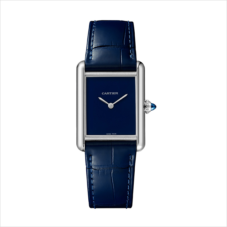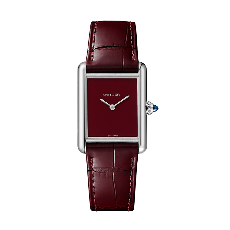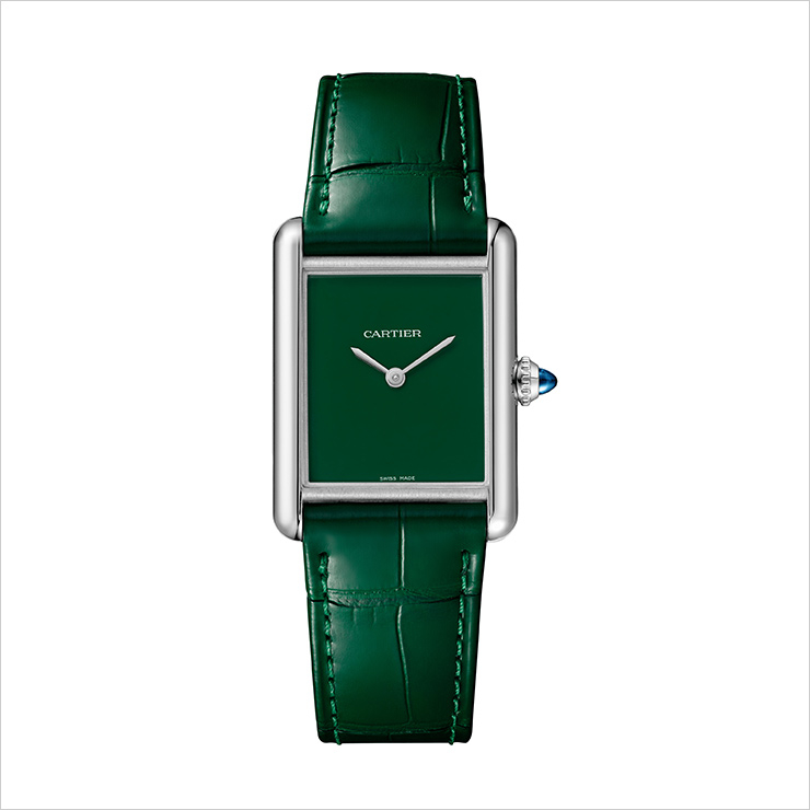 까르띠에는 이번 탱크 머스트를 새롭게 론칭하면서 색다른 버전도 함께 출시했다. 1980년대 레트로 무드를 풍기는 레드, 블루, 그린의 3가지 단색 다이얼 버전이 바로 그것. 로마숫자 인덱스나 레일 트랙을 걷어내고 시곗바늘과 까르띠에 로고만 남긴 미니멀한 디자인, 다이얼과 컬러를 맞춘 악어가죽 스트랩이 특히 눈길을 끈다. 이 모델은 라지 사이즈로만 출시한다.