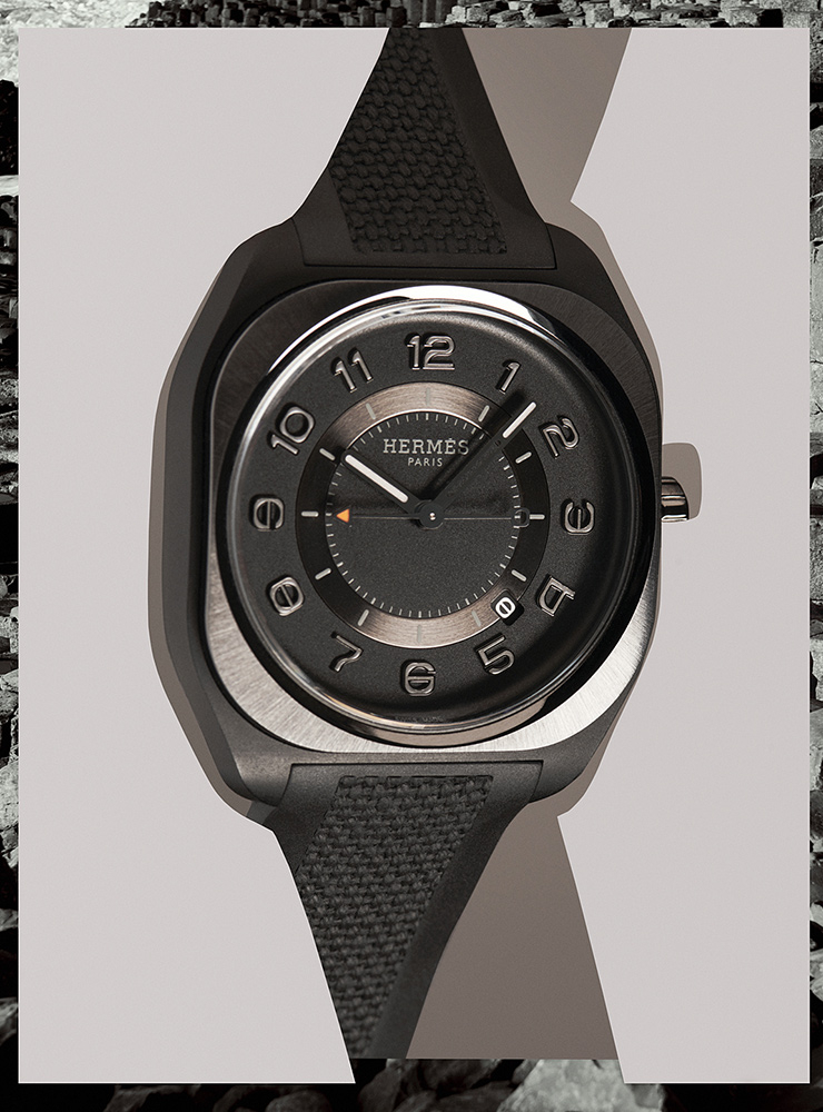 H08 H08은 올해 에르메스가 야심 차게 출시하는 차세대 스포츠 워치다. 2015년 슬림 데르메스 이후 무려 6년 만에 선보이는 새로운 남성 시계 컬렉션으로, 공백이 길었던 만큼 만반의 준비를 한 것이 느껴진다. 고심의 흔적은 H08이라는 모델명에서부터 확인할 수 있다. 브랜드의 이니셜인 H와 무(無)를 뜻하는 0 뒤로 일부 문화권에서 행운을 상징하고 90도 기울였을 때 무한대를 의미하는 8을 더한 것. 이를 위해 에르메스는 아라비아숫자 인덱스 중 0과 8의 형태를 새롭게 디자인하고, 케이스 형태도 여기에 어울리도록 다듬었다. 케이스는 일반적인 원형이 아니라 사각형 모서리를 둥글게 굴린 39×39mm 사이즈의 쿠션형. 유광과 무광 피니싱을 적절하게 활용해 모든 면과 각을 섬세하게 마감했다. H08을 특별하게 만드는 세부는 이뿐만이 아니다. 케이스의 소재로 스틸을 과감하게 배제하고 탄소 기반 합성 신소재인 그래핀과 티타늄을 사용한 것도 눈여겨볼 만한 대목이다. 언제 어디서나 편하게 착용할 수 있도록 경량화에 초점을 맞춘 결과다. 각각 다른 질감과 미묘한 색깔 차이로 입체감을 더한 다이얼에서도 이 시계에 대한 에르메스의 애정이 드러난다. 그래핀 케이스에는 러버 스트랩을, 무광 블랙 DLC 코팅 티타늄 케이스에는 러버 또는 우븐 스트랩을, 티타늄 케이스에는 우븐이나 러버 스트랩 또는 브레이슬릿을 매치했다. 3가지 모델 모두 에르메스 인하우스 오토매틱 무브먼트 H1837을 탑재했다.