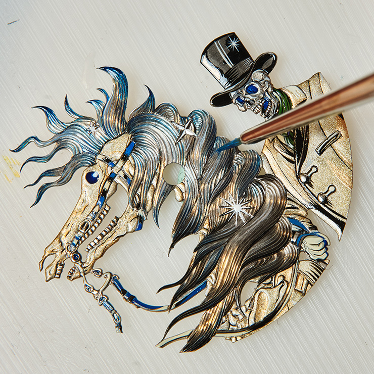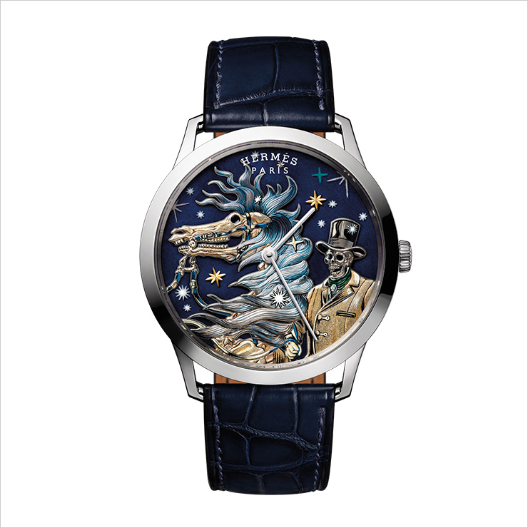 슬림 데르메스 세 라 페트 세계 최고의 패션 하우스가 쌓아온 방대한 아카이브는 워치 컬렉션에서도 유효하다. 그 좋은 예가 바로 슬림 데르메스 세 라 페트다. 이 시계는 에르메스의 대표적인 드레스 워치 슬림 데르메스에 독특한 유머를 입힌 모델이다. 뼈만 남은 말 위에 연미복과 중절모를 쓴 해골 신사가 단박에 눈길을 잡아 끄는데, 이는 2012년 일본의 일러스트레이터 다이스케 노무라가 디자인한 남성용 실크 스카프에서 착안했다. 하지만 이 시계를 진정 특별하게 만드는 건 유쾌한 모티프와 대비를 이루는 정교한 디테일이다. 다이얼은 화이트 골드 표면에 내추럴 오일을 혼합한 유리 파우더를 바르고, 이러한 과정을 몇 겹에 걸쳐 진행해 가마에 구운 다음 인그레이빙 장인의 손길까지 더해 완성한다.