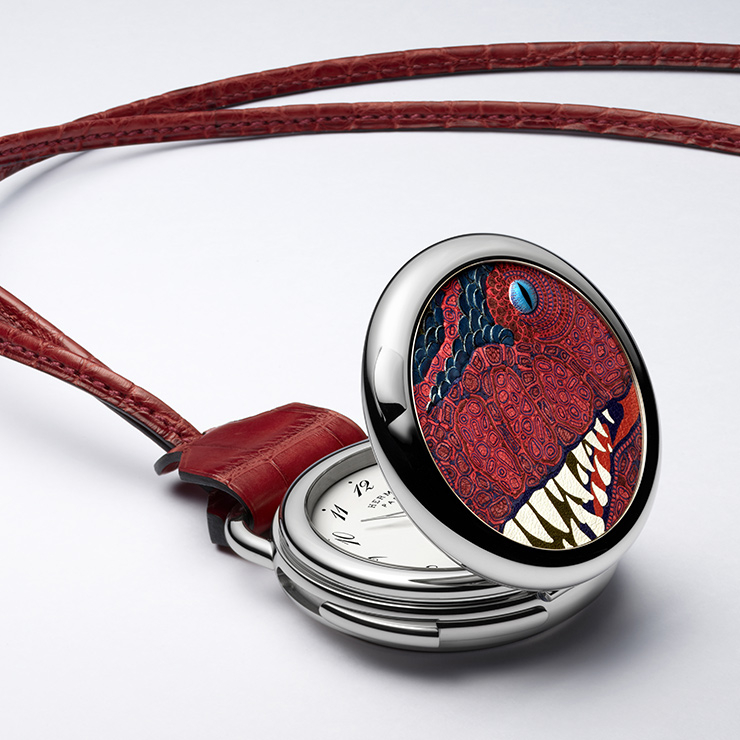 아쏘 포켓 으악! 아쏘 그르르르!, 아쏘 아우우우!를 잇는 위트 있는 작명의 시계. 앨리스 셜리가 디자인한 에르메스 스카프 디자인에서 힌트를 얻어 탄생했다. 하지만 스카프 이미지를 단순히 시계에 옮긴 것은 아니다. 에르메스는 작은 포켓 워치 커버에 이를 표현하기 위해 브랜드의 장기를 십분 발휘했다. 수천 개의 가죽 조각을 손으로 일일이 자르고 붙여 현창을 엿보는 살벌한 티라노사우루스를 완성한 것. 공룡의 머리와 비닐엔 모자이크 기법을, 턱과 혀 부분엔 상감 기법을 사용하고, 눈은 카보숑 컷 그랑푀 에나멜로 제작해 특유의 광택을 더했다. 그리고 아쏘의 특징인 등자 형태 러그엔 레드 악어가죽 코드 스트랩을 더해 마무리했다. 무엇보다 놀라운 대목은 사실 이 포켓 워치가 플라잉 투르비용과 미니트 리피터를 결합한 그랑 컴플리케이션 시계라는 점. 그랑 컴플리케이션 워치를 이렇게 만들 수 있는 브랜드가 또 있을까? 에르메스이기에 가능한 시계라고 말할 수밖에. 전 세계 단 한 피스만 제작한다.