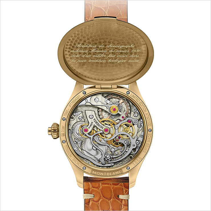 케이스백 커버 안쪽에는 ‘스위스 워치메이킹 전통을 따른 1930년대 핸드메이드 칼리버 탑재 미네르바 밀리터리 크로노그래프의 리에디션’이라는 문구를 새겼다. 오피서 케이스백을 열면 미네르바 칼리버를 충실하게 재구성한 매뉴팩처 모노푸셔 크로노그래프 무브먼트 MB M16.29가 모습을 드러낸다. 오리지널 크로노그래프 칼리버와 동일하게 MB M16.29는 V자 모양 브리지, 칼럼 휠, 수평 커플링, 1만8000A/H의 진동수를 갖췄다. 유서 깊은 무브먼트를 기념하기 위해 크로노그래프 블로커 끝에는 미네르바 화살도 얹었다. 당연히 무브먼트 세공에도 각별한 주의를 기울였다. 메인 플레이트와 브리지는 순수한 저먼 실버로 제작했으며, 코트 드 주네브, 페를라주와 앵글라주, 베벨링 등으로 정교하게 장식했다.