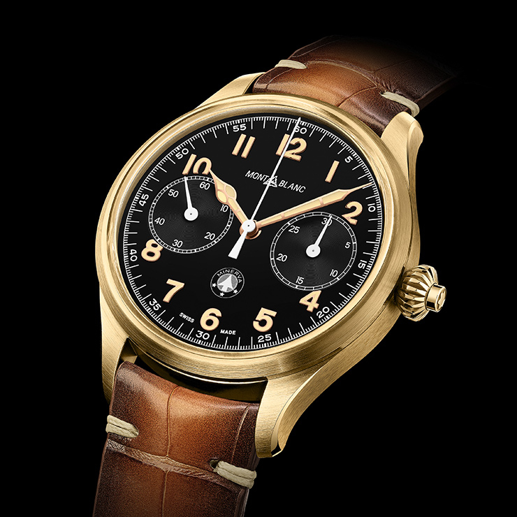 몽블랑 1858 모노푸셔 크로노그래프 오리진스 리미티드 에디션 100 1930년대 개발된 46mm 미네르바 밀리터리 모노푸셔 크로노그래프를 재현한 시계. 46mm의 대범한 케이스와 블랙 다이얼, 바이컴팩스 카운터, 베이지색 인덱스와 카테드랄 핸즈, 레일로드 미니트 트랙 등 오리지널 모델의 특징을 성실하게 계승하고 있다. 스틸을 대신하는 특수 브론즈 합금 케이스, 12시 방향의 빈티지 몽블랑 로고와 6시 방향의 미네르바 로고는 전에 없던 변화지만, 전체적인 디자인과 조화를 이루며 레트로 무드를 강조한다. 게다가 전통적인 포켓 워치처럼 열리는 오피서 케이스백을 적용했다.