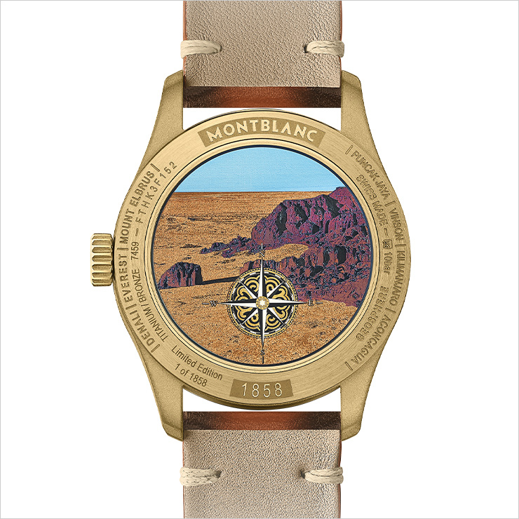 몽블랑 1858 지오스피어 리미티드 에디션 1858 2018년부터 매년 산과 숲, 빙하를 탐험하며 도전 정신을 되새겨온 몽블랑 1858 지오스피어 컬렉션이 올해는 사막으로 향했다. 몽블랑 1858 지오스피어 리미티드 에디션 1858은 2000km에 달하는 고비사막을 5주간 홀로 횡단한 전설적인 탐험가 라인홀트 메스너에 헌정하는 모델이다. 일단 사막의 모래와 암석을 표현하기 위해 브라운과 베이지 컬러로 세부를 통일한 디자인이 눈길을 끈다. 새틴 처리한 42mm 브론즈 케이스와 방위를 표시한 브라운 세라믹 양방향 회전 베젤, 브라운 그러데이션 래커 다이얼, 로즈 골드 코팅과 모래색 래커를 혼합한 핸즈 및 인덱스, 베이지 스티칭을 더한 빈티지 브라운 스푸마토 카프 스트랩이 바로 그 면면. 게다가 낮/밤 인디케이터, 카테드랄 핸즈와 인덱스, 나침반 표시, 회전 반구에 입힌 슈퍼 루미노바 코팅 역시 베이지 컬러를 택한 세심함이 돋보인다. 케이스백엔 바양작으로도 알려진 고비사막의 불타는 절벽을 인그레이빙했다. 해 질 무렵 불타는 것처럼 환해지는 이 사암 절벽은 라인홀트 메스너의 트레킹 경로에 실제 포함되었던 지역. 몽블랑은 입체적인 렌더링 효과를 실제처럼 전달하는 특수 기법으로 고비사막을 강조하고 사진과 유사한 심도를 표현했다.