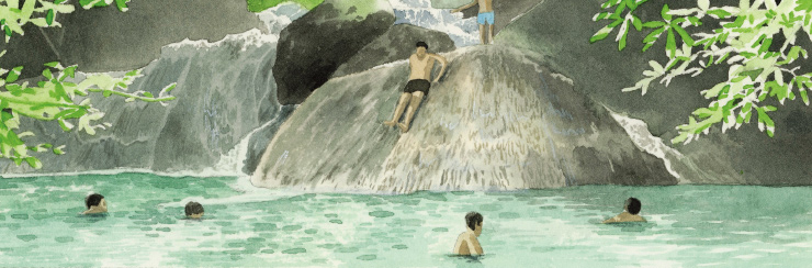7단계에 도착하면 산꼭대기에서 떨어지는 폭포수를 온몸으로 맞을 수 있다. 직격으로 떨어지는 물살이 꽤나 아프기도 하지만, 동시에 힘겹게 올라온 수고를 보상받는 시원함도 있다. 문제는 거기서부터 다시 오른 길로 내려와야 한다는 것뿐. 돌아서 보니 어느새 하늘은 물의 색과는 상반되는 붉은빛으로 저물고 있었다. 높은 지대에서 탁 트인 풍경을 내려다보노라니 그야말로 절경이었다. 숙소까지 돌아왔을 때는 거의 ‘방전’ 상태였으나 근처에서 생선구이와 맥주를 시켜 한 입 먹으니 다시 활력이 샘솟았다. 그 즐거움이란! 물놀이나 산행 후에 먹는 맥주가 꿀맛이라는 건 보편적 진리지만 그 상황에 이를 때마다 매번 새롭게 감탄하게 되는 법이다.