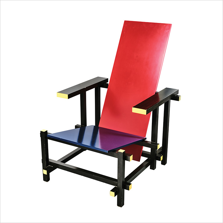 등받이 기울기 25도, 시트 기울기 10도. 게리트 리트펠트가 찾아낸 의자의 황금비율이다. 막대를 조합해 만든 가장 간단하고 본질적인 의자, 세부를 뜯어보면 각목으로 뚝딱뚝딱 만들었다 해도 이상하지 않을 이 의자의 명성은 직관에서 나온다. 누구나 한눈에 몬드리안의 추상화 ‘빨강, 노랑, 검정, 회색과 파랑의 조합’을 연상할 것이다. 한쪽은 의자고 다른 쪽은 추상화지만 이 의자의 컬러 배치와 형태를 본 우리의 눈이 둘을 단박에 연결해 인식할 만큼 유사하다. 3D로 구현된 몬드리안이라고나 할까? ‘모더니즘의 이상을 눈에 보이고 손으로 만질 수 있는 물질 형태로 옮겨놓은 것’이라는 평가 그대로 레드 블루 체어는 그래서 의자가 된 추상이다.