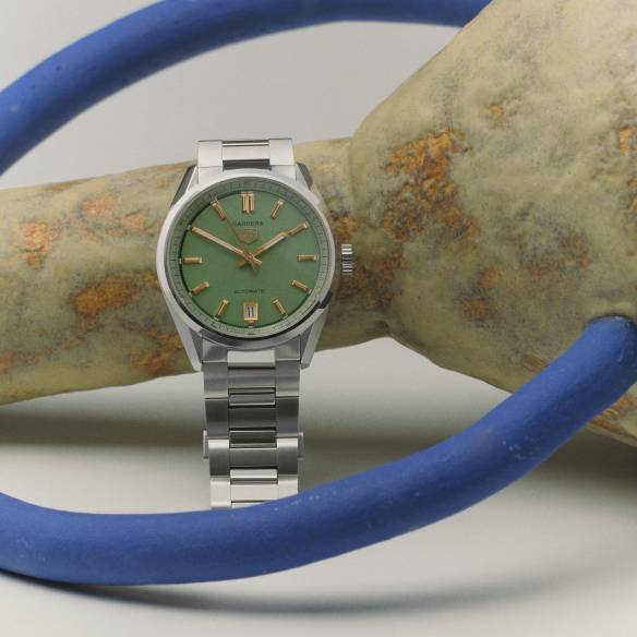 40mm 스틸 케이스와 피스타치오 그린 다이얼, 골드 브라운 가죽 스트랩의 프리미에르 B09 크로노그래프 40 990만원대 브라이틀링. 브라운 스리피스 슈트 로드앤테일러. 화이트 셔츠, 타이 모두 스타일리스트 소장품.