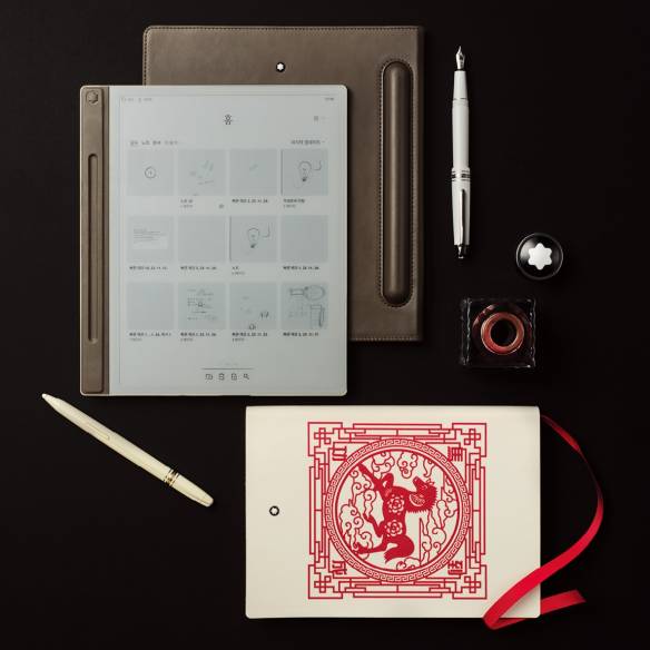 몽블랑의 엠블럼이 돋보이는 ‘스타워커 울트라블랙 레진 파인라이너’, 산악 탐험 정신을 담은 월드타이머 ‘1858 지오스피어 울트라블랙 리미티드 에디션 858’ 워치, 사피아노 레더 커버로 이뤄진 ‘#146 노트 망가니즈 오렌지’ 노트 모두 몽블랑. 니트 존 바바토스, 재킷 비오비.