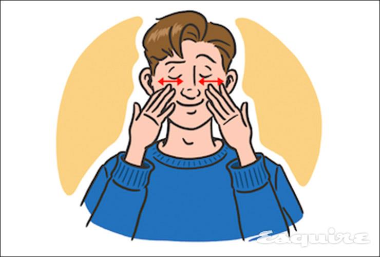 눈과 관자놀이 사이 움푹 들어간 부위를 지그시 누르고, 원을 그리며 1분간 마사지한다.