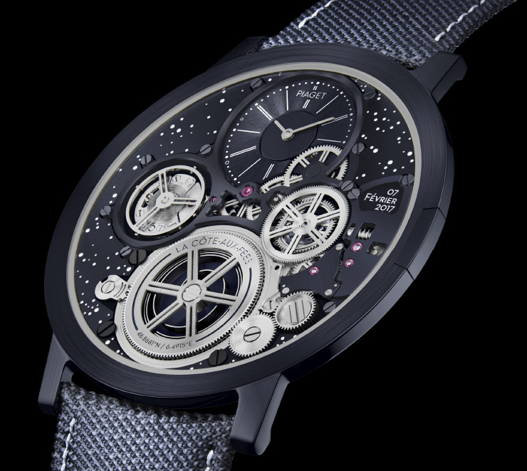 울트라 신 분야에서 피아제가 일군 업적은 누구도 부인할 수 없다. 끊임없이 워치메이킹 한계에 도전하며 새로운 가능성을 증명해왔기 때문. 초박형 시계에 대한 이들의 열정과 노하우는 마침내 2018년 선보인 알티플라노 울티메이트 콘셉트에서 빛을 발했다. 무브먼트와 다이얼을 통합해 두께를 2mm로 줄인 이 시계는 말 그대로 울트라 신 설계의 혁신. 각 부품들의 건축적 요소는 마이크로 메커니컬 엔지니어링 그 자체였다. 그리고 올해 피아제는 알티플라노 울티메이트 콘셉트의 새 버전으로 그 영광을 이어갔다. 전체적인 기능과 구조는 전작과 동일하다. 하지만 다이얼 배경에는 밤하늘의 별처럼 촘촘하게 슈퍼 루미노바를 박아 넣었다. 피아제 라코토페 매뉴팩처에서 바라본 밤하늘의 모습을 모사한 것이다. 또 래칫 톱니바퀴 휠에는 매뉴팩처의 좌표를 새기고, 다이얼의 2시 30분 방향에는 시계가 처음 작동한 순간인 2017년 2월 7일을 새겨 넣었다. 그러니까 이 시계는 피아제의 여정이 시작된 라코토페 매뉴팩처에 헌정하는 모델인 셈이다. 케이스 사이즈는 41mm. 새틴 브러싱 가공 처리한 코발트 기반 합금으로 완성했다.