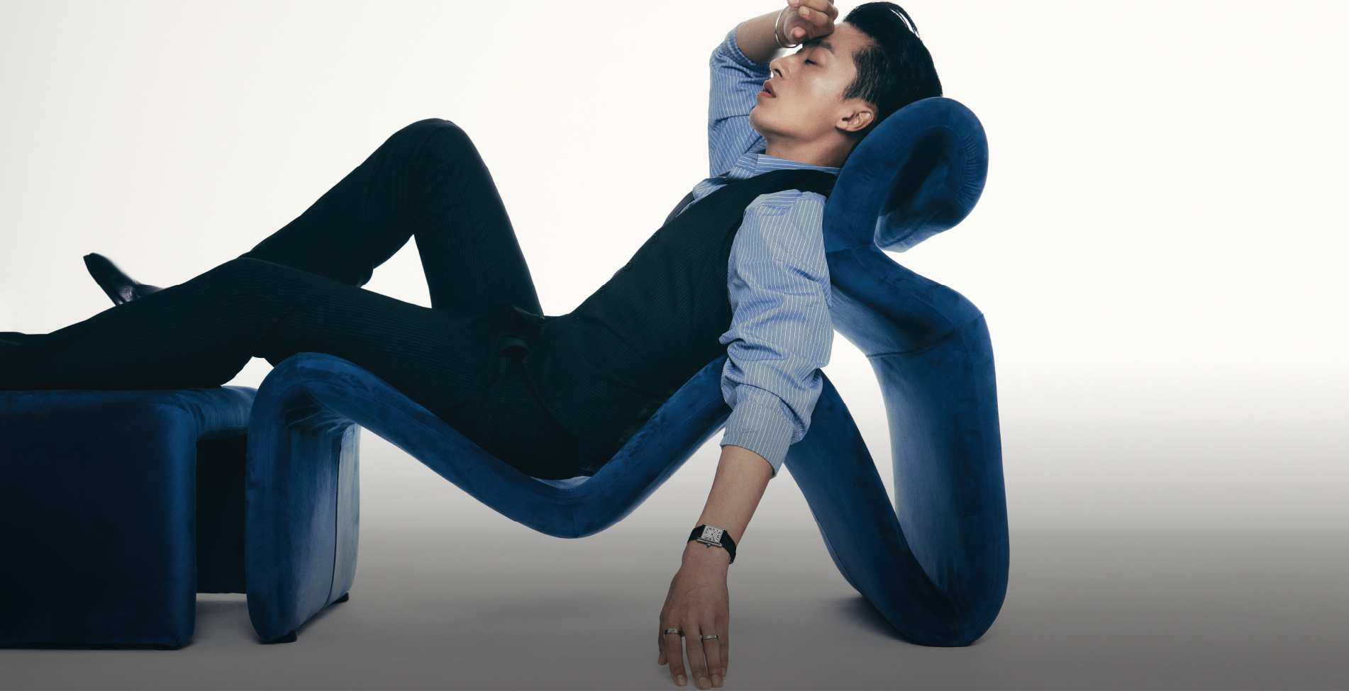 18K 화이트 골드 저스트 앵 끌루 브레이슬릿, 스틸 케이스의 라지 탱크 머스트 워치, 18K 화이트 골드 러브 링, 18K 화이트 골드 러브 웨딩 밴드 모두 까르띠에. 셔츠 벨루티. 슈즈 손신발. 베스트, 팬츠 모두 스타일리스트 소장품.