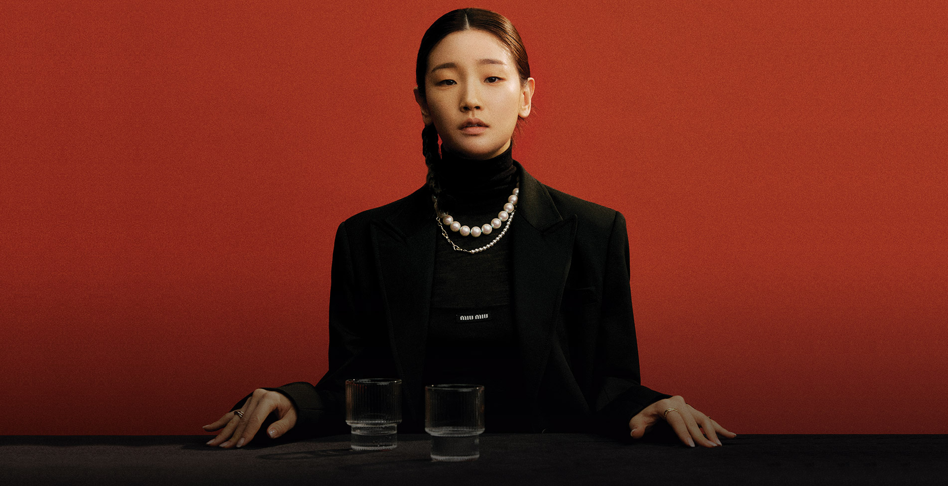 재킷, 톱 모두 미우미우. 터틀넥 코스. 네크리스 위부터 넘버링, 일리앤. 오른손 약지 링 로아주. 왼손 검지 링 헤이. 소지 링 일리앤.