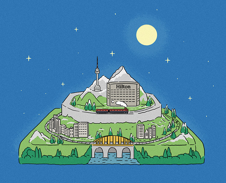 겨울 밀튼(밀레니엄 힐튼 서울의 애칭)의 상징과도 같은 크리스마스트리를 지나 그 유명한 자선열차 앞에 섰다. 모두 밀레니엄 힐튼 서울(이하 ‘힐튼’)이 ‘서울 힐튼’이던 시절부터 여기 있던 것들이다. 미니어처로 제작한 유럽식 마을을 빙빙 도는 장난감 열차 앞에 부모 손을 잡은 꼬마들이 옹기종기 모여 있다. 아이들이 열차를 구경하는 동안 어른들은 열차 옆면에 붙은 기업 로고를 눈으로 훑는다. 두카티, 코카콜라, 할리데이비슨, 이지스자산운용… 올해 후원금을 낸 ‘골드 서포터즈’ 중에는 머지않아 이곳의 새 주인이 될 투자사 이름도 포함되어 있다. 아들이 혼자 계단을 오르내릴 무렵부터 매해 크리스마스 시즌 이곳을 찾았다는 지인 K는 얼마 전 인스타그램에 자선열차를 배경으로 한 가족사진을 여러 장 올렸다. 최근 찍은 사진에서 K의 아들은 열차를 에두른 160cm 높이의 유리 스크린보다 머리 하나가 더 크다.