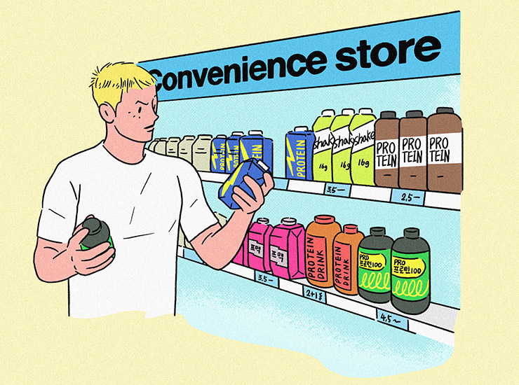 한국 성인의 단백질 섭취량은 평균 72g으로 권장 섭취량을 웃돈다. 하지만 근력운동을 열심히 하는 체중이 70kg인 사람이라면 근성장을 위한 하루 단백질 섭취량은 112g이다. 간극을 채우려면 평소보다 단백질 섭취를 40g 늘려야 한다. 편의점 프로틴 음료 한 병에 들어 있는 단백질이 일반적으로 20~27g이니까 하루 한두 병은 더 마셔줘야 한다는 계산이 나온다.