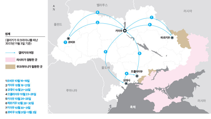 우크라이나 남부의 므콜라이우는 그간 돌아다닌 곳 중 전쟁이 피부로 느껴지는 첫 번째 방문지였다. 가까운 곳에서 대포 소리가 울렸고, 사람들은 누구랄 것 없이 모두 초조해하며 긴장했다. 최전선은 므콜라이우 시내에서 불과 몇 킬로미터 밖에 있었다. 전선은 동쪽으로 2시간 거리인 헤르손을 향해 느리지만 분명히 움직이고 있었다. 2주 정도 지나면 헤르손도 해방될 것이다. 하지만 사람들은 그에 대해 기뻐하기보다는 러시아가 헤르손을 우크라이나에게 다시 넘겨주느니 댐을 폭파해 침수시킨다거나 전술핵, 스페츠나츠(러시아 특수부대), 체첸의 자살특공대를 배치할지도 모른다는 소문을 곱씹었다.