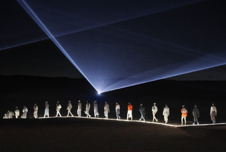 디올 맨 아티스틱 디렉터 킴 존스의 컬렉션에 대한 소개는 그가 왜 이렇게 멀고 험한 가자지구를 힘들여 찾아왔는지, 그리고 어떤 방식으로 이렇게 우아한 퓨처리즘을 구현할 수 있었는지를 단박에 알게 해준다. 크림 컬러, 그레이, 아이보리 등 다양한 뉴트럴 컬러로 시작된 패션쇼. 피라미드를 모티브로 한 기하학 패턴, 정교하게 레이어링된 스타일링과 액세서리가 쇼의 완성도를 높였다. 수광년 떨어진 은하계의 무수한 별들과 우주의 신비로운 컬러를 프린트한 블랙 테크니컬 캔버스 소재의 아우터로 쇼의 대미를 장식하면서 강렬한 이미지를 남겼다. 모래언덕의 능선을 따라 걸으며 피날레를 장식하는 모델들과 그 배경이 된 피라미드의 조합은 직접 목격하고 있으면서도 비현실적으로 느껴질 만큼 충격적인 장관이었다.