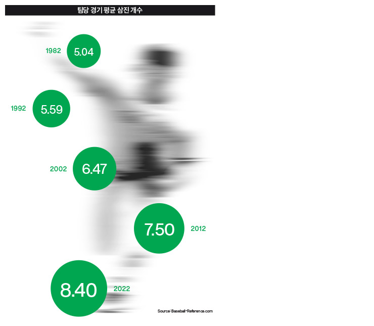 하지만 알고 보면 그 모든 것은 근거 없는 신화다. 그들이 한 스포츠는 같은 스포츠가 아니다. 야구는 시대에 따라 크게 달라졌다. 1961년을 예로 들어보자. 당신이 야구 팬이라면, 작년에 애런 저지가 로저 매리스의 아메리칸 리그 홈런 기록을 추격해가는 걸 보면서 아마 1961년 생각을 꽤 많이 했을 것이다. 매리스는 1961년에 61개의 홈런을 때렸다. 저지는 2022년에 62개를 기록했다. 팬들은 이 두 기록을 나란히 두고 비교한다. 하지만 1961년의 야구와 2022년의 야구는 완전히 다른 스포츠다. 당시에는 18개 팀이 있었고, 지금은 30개 팀이 있다. 당시엔 선발투수들이 선발 출장한 경기의 4분의 1 이상을 완투했다. 지금 선발투수가 완투하는 경기는 출장 경기의 1%도 되지 않는다. 1961년에는 양 팀을 합쳐 한 경기당 대략 10개 정도의 삼진, 17~18개의 안타가 나왔다. 지금은 삼진 17개, 안타 16개 정도다. 1961년의 경기 시간은 두 시간 반을 조금 넘겼다. 2022년 MLB의 평균 경기 시간은 3시간 7분이었다.