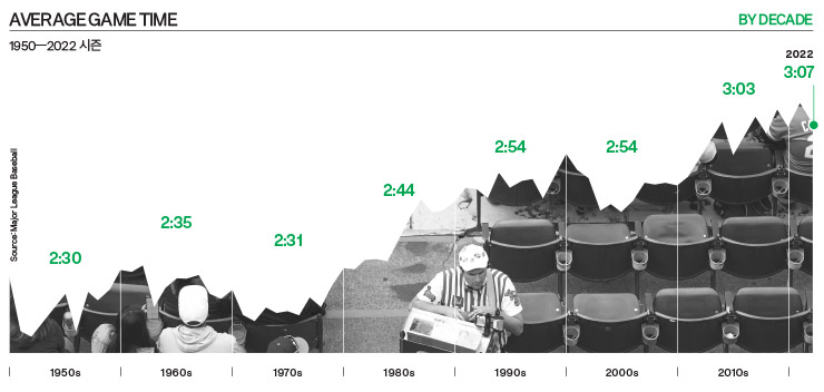 2023년, MLB에는 변화가 찾아온다. 큰 변화다. 게임 자체를 바꿔놓을 수 있는 변화다. 왜 지금인가? 야구는 넘지 말아야 할 선을 정하기로 마침내 결심했다. 야구가 직면하고 있는 이슈들은 오래전부터 뉴스에 오르내렸다. 최근 10년간 관중 수는 감소했다. 설문조사에 따르면 야구는 농구와 축구에 점점 밀려나고 있으며, 특히 젊은 팬층 사이에서 그런 경향이 심하다. 야구 텔레비전 시청률이 떨어지는 것을 크게 문제 삼는 이들이 많지만, 사실은 그보다 더 복잡한 문제다. 지역 텔레비전 시청률은 지금도 높다. 하지만 2022년 월드 시리즈 시청률이 처음 시청률 트래킹을 시작한 50년 전 이후 두 번째로 낮았다는 것은 분명한 사실이다(최저는 2020년 ‘코비드’ 월드 시리즈였다).