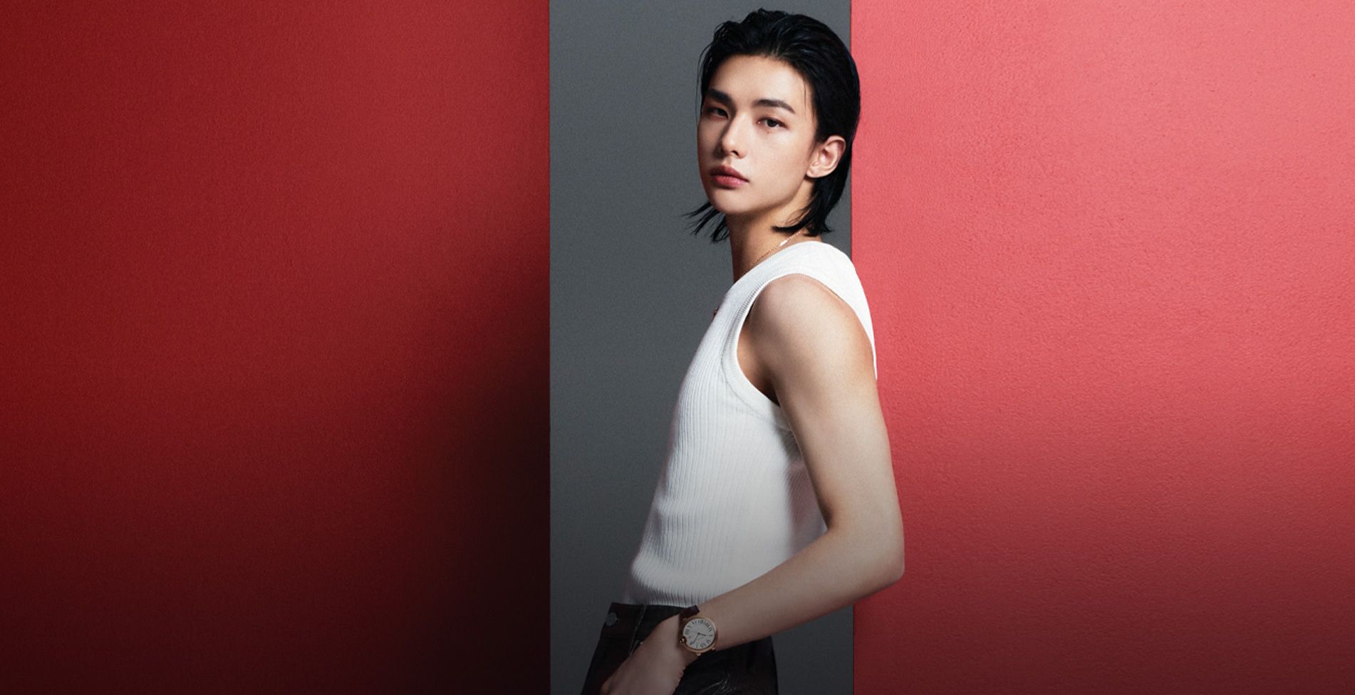 42mm 핑크 골드 케이스와 브라운 앨리게이터 레더 스트랩의 발롱 블루 드 까르띠에 워치, 트리니티 네크리스, 트리니티 링 모두 까르띠에. 슬리브리스 톱 렉토. 팬츠 프롬아를. 슈즈 스타일리스트 소장품.