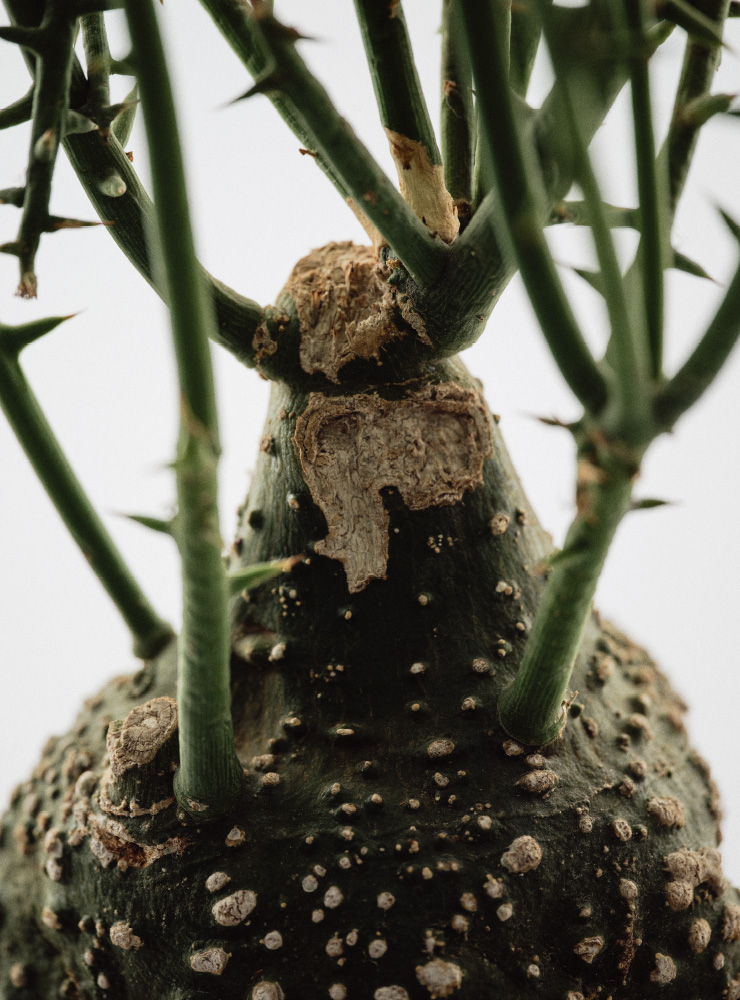 고어플랜트서울은 세계 각지의 괴근식물을 취급하는 플랜트숍. 그 대표인 안봉환에게 당신의 식물 중 하나를 소개해달라고 했을 때, 그가 온갖 진귀한 것들 사이에서 아데니아 글로보사를 고른 건 이 개체가 최근 사람들의 경악을 들었기 때문이다. “전시 플랫폼과의 협업이 있어서 식물들을 챙겨 갔었어요. 그런데 그때 차에서 아데니아 글로보사를 꺼내는 순간, 주변 사람들이 다들 기겁하더라고요. ‘뭐야 저거?’ 하면서. 아마 살면서 이렇게 생긴 식물은 처음 봤으니까 그랬겠죠.” 아프리카 동부 연안에 서식하는 아데니아 글로보사는 울퉁불퉁 돌기가 솟은 철퇴 같은 몸통에서 가시 철조망 같은 가지가 날카롭게 뻗치는 형태를 가진 괴근식물이다. 처음 보면 누구라도 놀랄 수밖에 없는 모양새인데, 몸통의 형태도 가지가 뻗는 모양도 개체마다 가지각색이기에 매번 새롭게 놀라게 된다. 다만 안봉환의 말은 그래서 사람들의 반응이 아쉬웠다는 게 아니라, 오히려 좋았다는 뜻이라고 했다. “누구나 좋아할 만한 식물은 사실 따로 있잖아요. 얘는 아닌 거죠. 누군가에게는 멋있는 느낌일 수 있지만 또 누군가에게는 징그러운 느낌일 수도 있고. 그런데 저는 그게 괴근식물의 가장 큰 매력이라고 생각해요. 딱 내 눈에 멋있고 내 마음에 차는 식물이 따로 있다는 게, 결국 각자의 취향을 대변해주는 거잖아요.” - 안봉환(고어플랜트서울 대표)