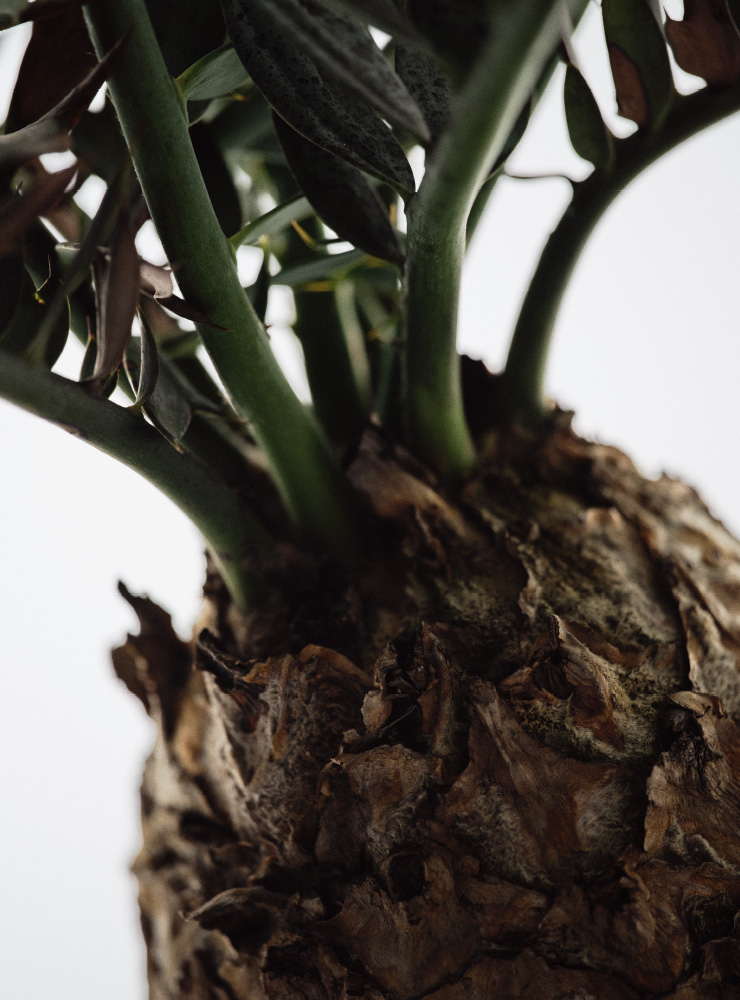임용관은 현재 약 100개의 파키포디움을 키우고 있다. 대학생 때부터 쭉 좋아해왔고, 혼자 살면서 키우기 시작한 게 수가 조금씩 늘다 현재에 이르렀다는 것이다. 그에게는 사람들에게 이 숫자를 납득시키는 그만의 방식도 있다. “운동화 모으는 것과 비슷하다고 생각하시면 돼요. 왜 스니커즈 컬렉터들도 디테일이 조금만 달라도 다른 모델로 취급을 하잖아요. 얘네도 마찬가지거든요. 제가 키우는 것 중에도 똑같은 종이 많지만 모양이 다 다르니까 모으는 재미가 있죠.” 파키포디움은 ‘두께’를 뜻하는 그리스어 ‘pachus’와 ‘발’을 의미하는 그리스어 ‘podion’의 조어로 만든 이름처럼 두꺼운 하부를 가진 다육식물로, 마다가스카르, 아프리카 등지에 다양한 품종이 분포되어 있다. 다육식물로 분류되지만 가시나 잎을 가진 나무 같은 모양으로 자라나고, 그 조직은 단단하기보다 일종의 스펀지처럼 물을 흡수하는 형태다. 그가 파키포디움이 가장 예뻐 보일 때로 꼽은 것도 바로 이때, 물을 줄 때다. “물을 주면 형태가 빵빵해지기도 하는데, 무엇보다 색이 달라져요. 은회색이던 줄기에 아래에서부터 녹색이 올라오면서 다양한 색깔을 보여주거든요. 하나하나 구경하는 재미가 있죠.” - 임용관(의사)