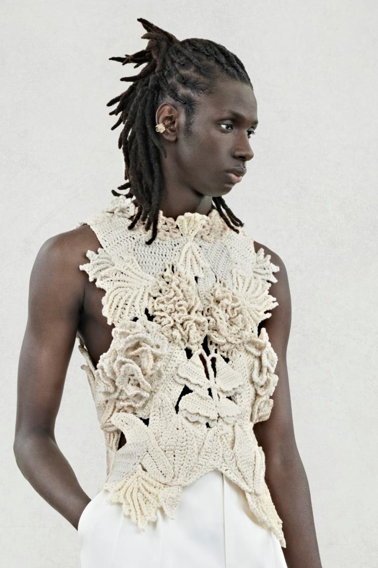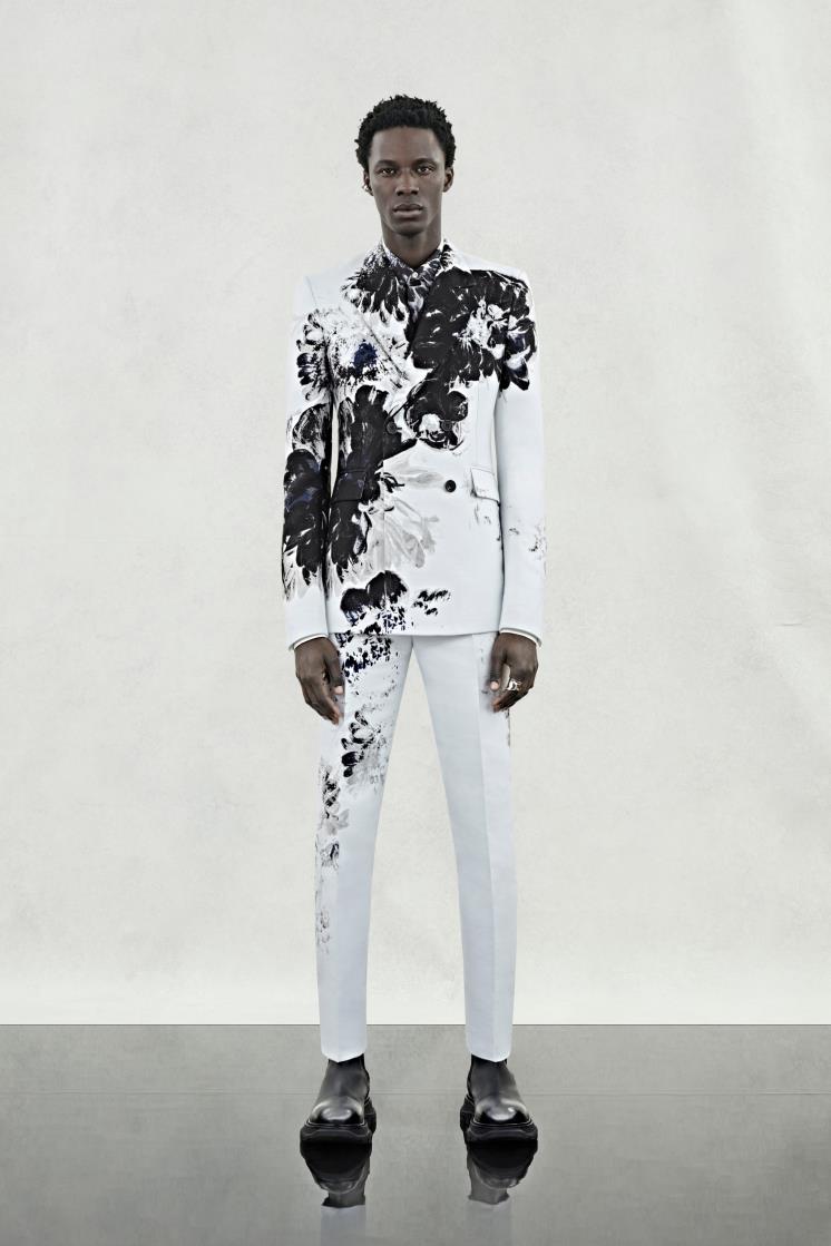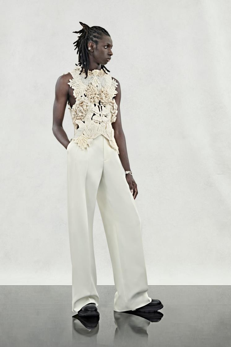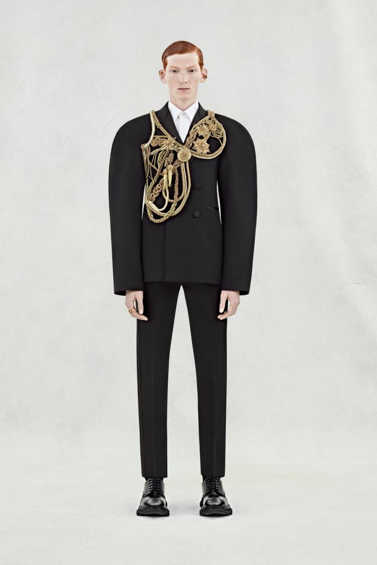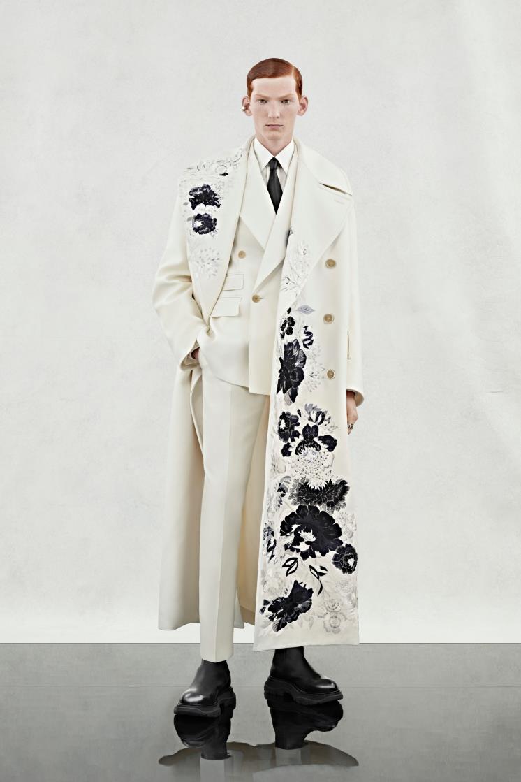 날렵한 실루엣으로 제작한 옷에는 세레모니 자수와 하네스 아플리케는 맥퀸의 아카이브에서 착안한 디테일을 가미하거나 허리에 체인을 달아 부드러운 터치를 더했다. 특히나 사이먼 언글레스가 고안한 주름 프린트를 자카르 자수로 코트나 재킷 위에 구현하며 주름이라는 곡선을 추상적으로 재해석한 디테일도 눈길을 끈다. 여기에 3차원의 핸드 크로셰 니트와 명암의 대비가 강조되게 제작하는 키아로스쿠스 꽃 모티프로 한층 더 입체적인 컬렉션을 완성했다.