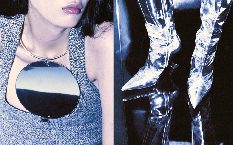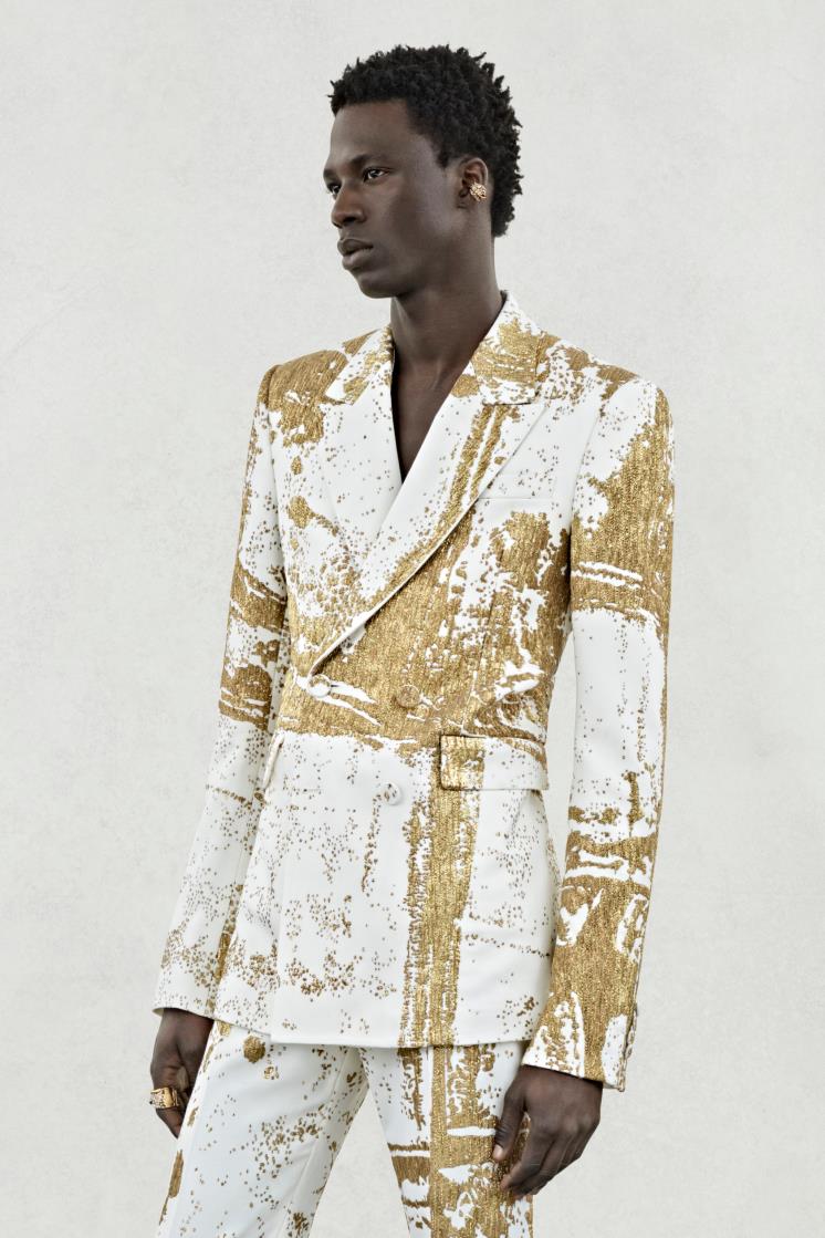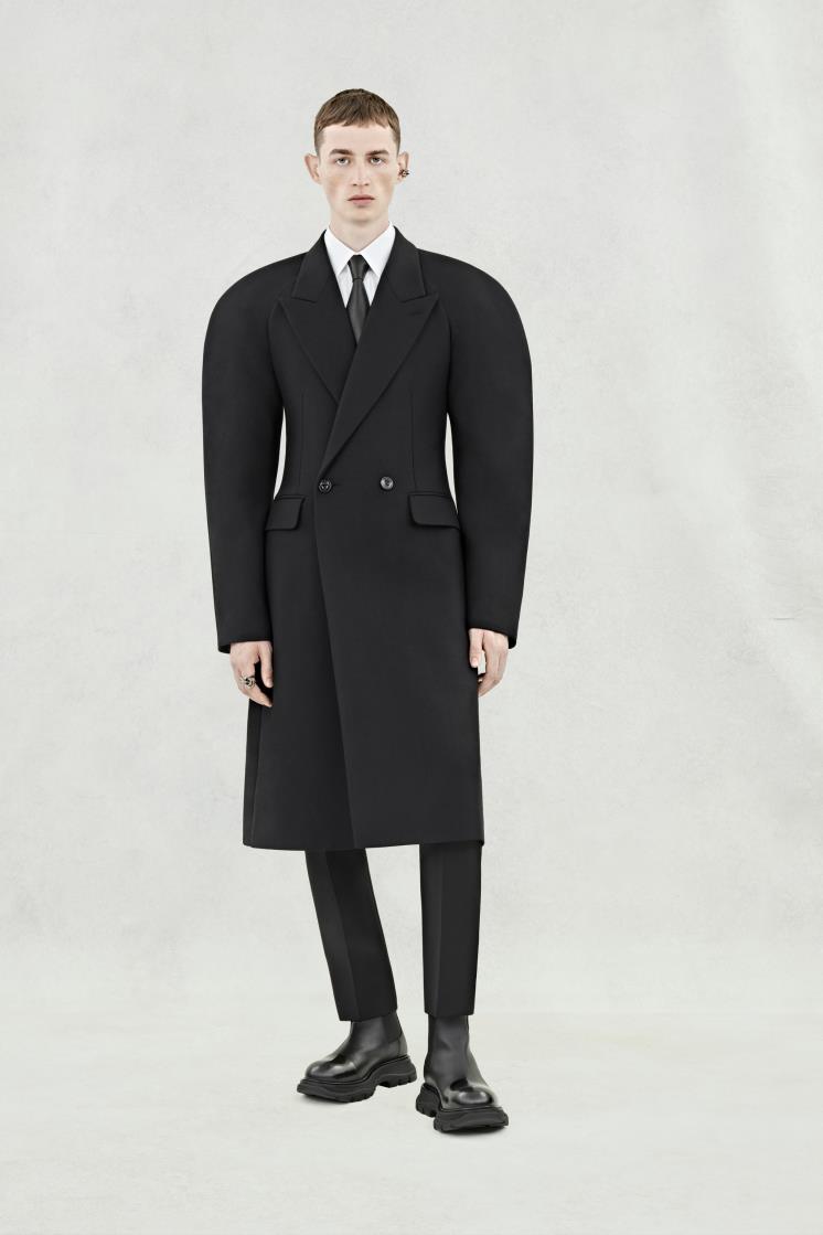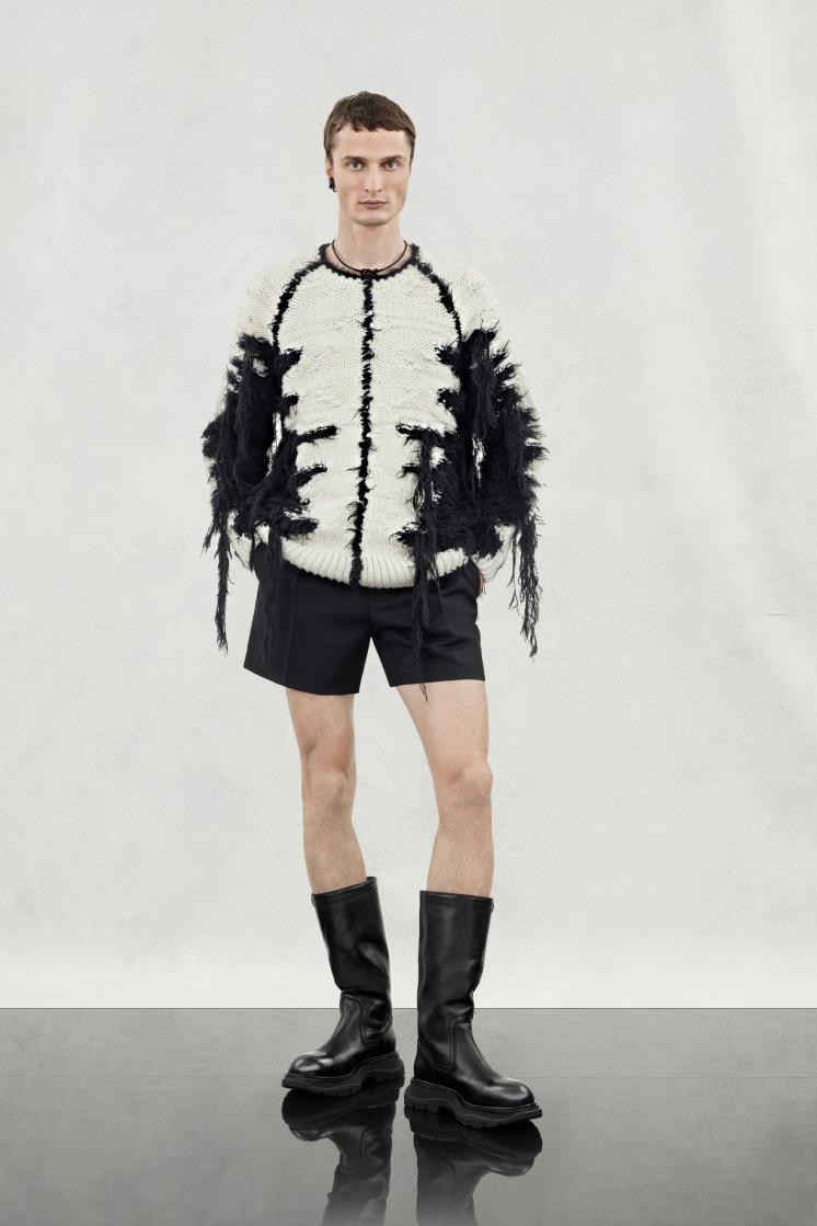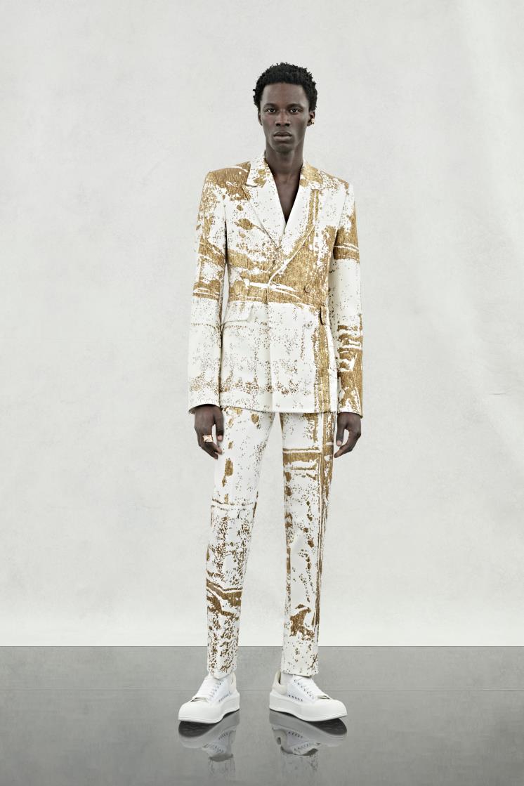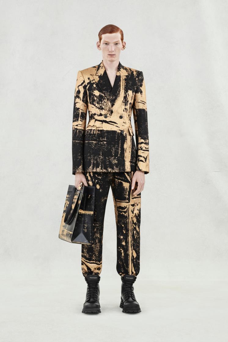 날렵한 실루엣으로 제작한 옷에는 세레모니 자수와 하네스 아플리케는 맥퀸의 아카이브에서 착안한 디테일을 가미하거나 허리에 체인을 달아 부드러운 터치를 더했다. 특히나 사이먼 언글레스가 고안한 주름 프린트를 자카르 자수로 코트나 재킷 위에 구현하며 주름이라는 곡선을 추상적으로 재해석한 디테일도 눈길을 끈다. 여기에 3차원의 핸드 크로셰 니트와 명암의 대비가 강조되게 제작하는 키아로스쿠스 꽃 모티프로 한층 더 입체적인 컬렉션을 완성했다.